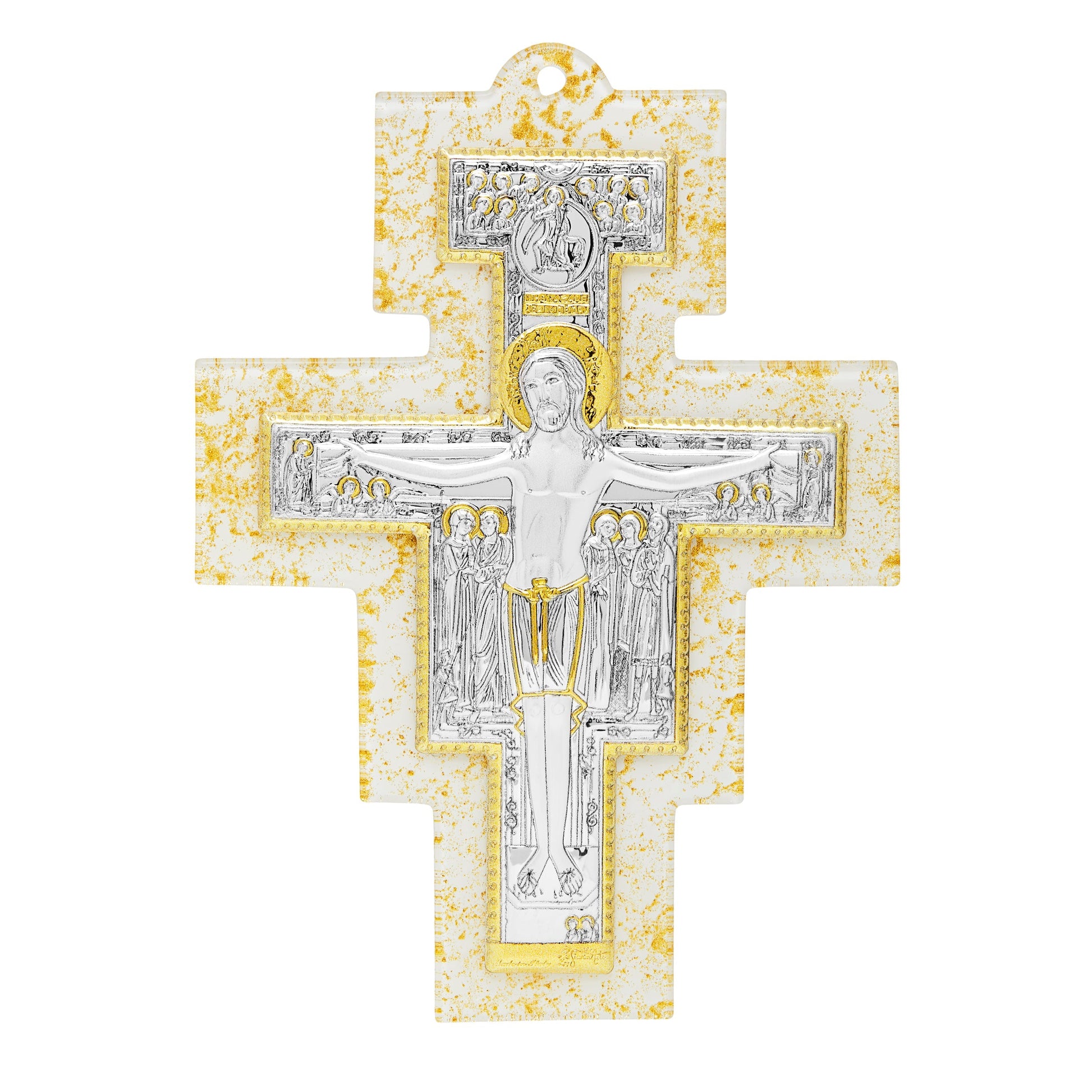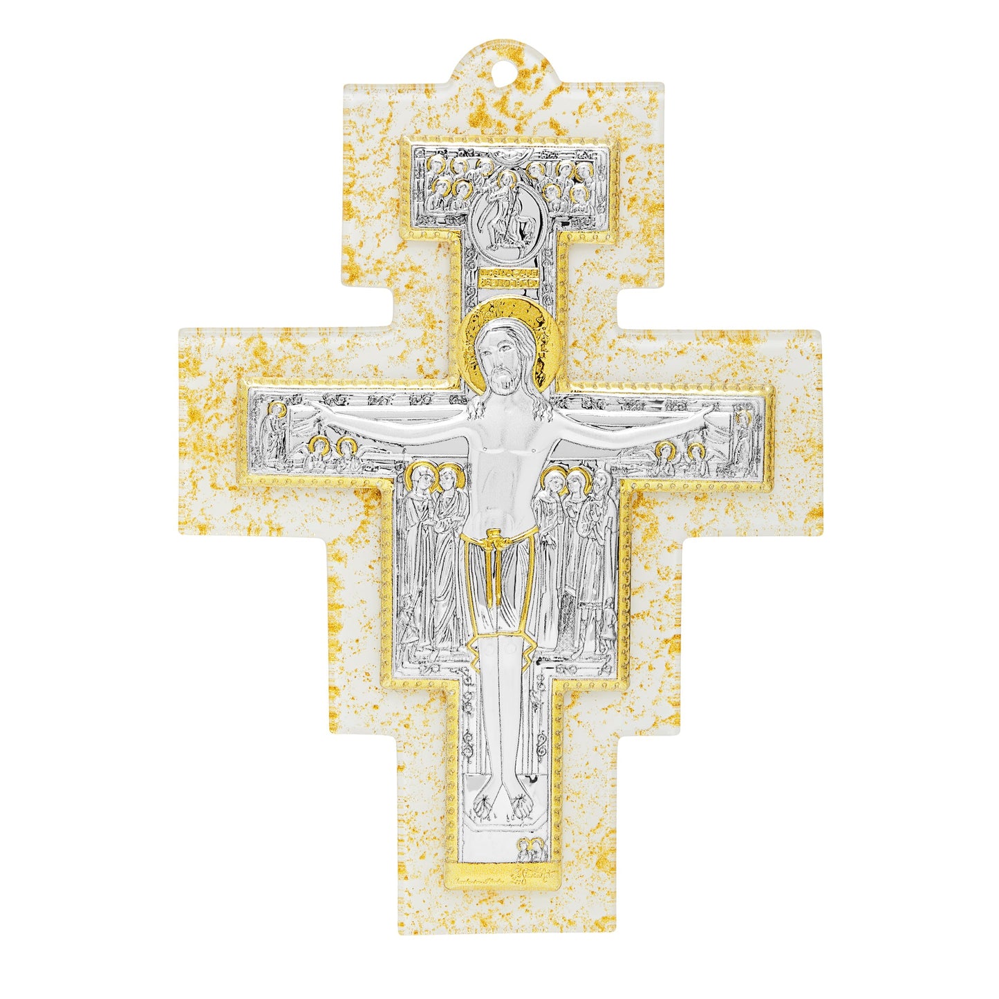 El crucifijo de San Damián es un icono en forma de cruz que representa la historia de la muerte, resurrección y ascensión en gloria de Cristo. Es el mismo crucifijo que San Francisco estaba rezando en la iglesia dedicada a San Damián cuando recibió el pedido del Señor de "reparar su iglesia". Nuestra preciosa Cruz de San Damián en Baño de Plata está realizada sobre una base de Vidrio de Murano.