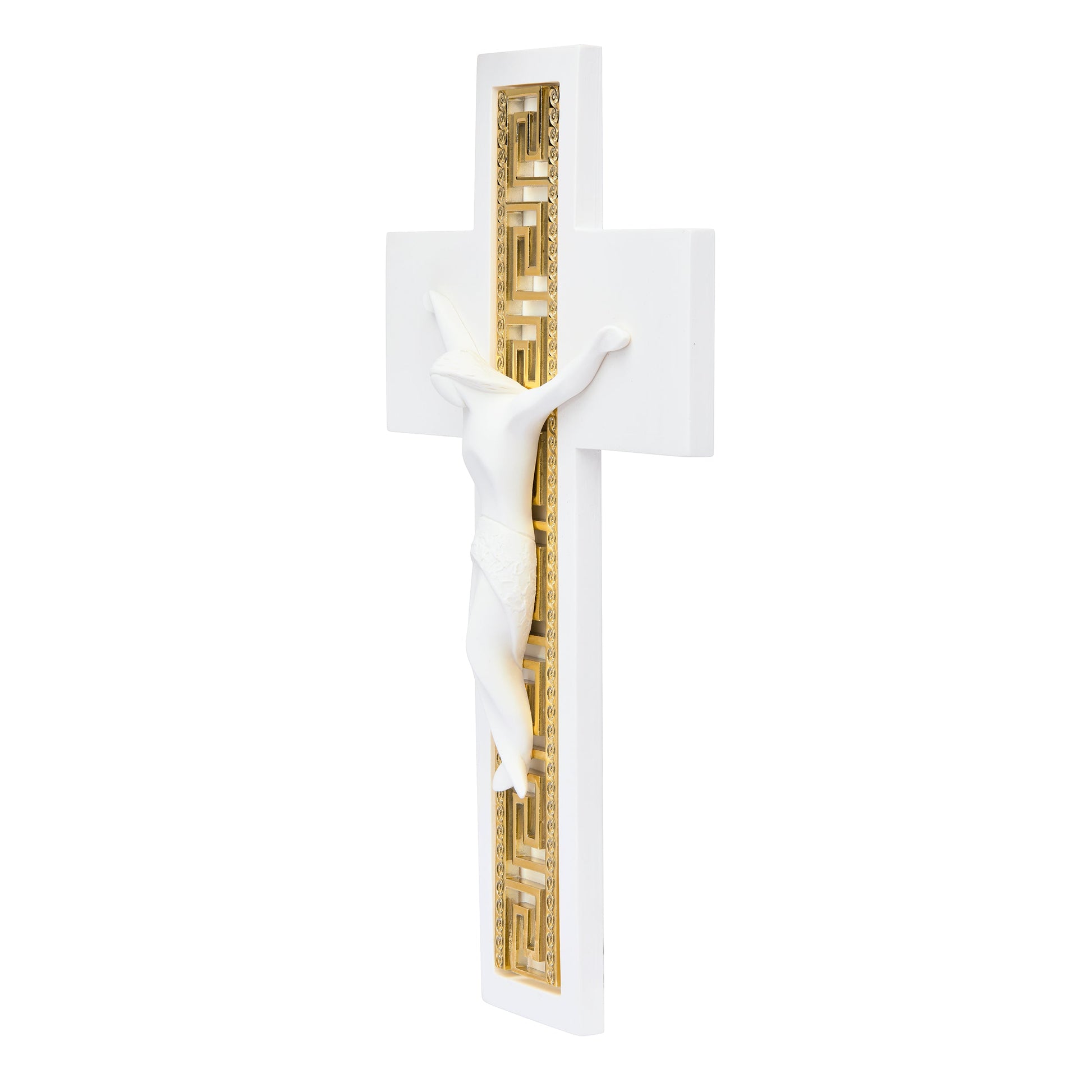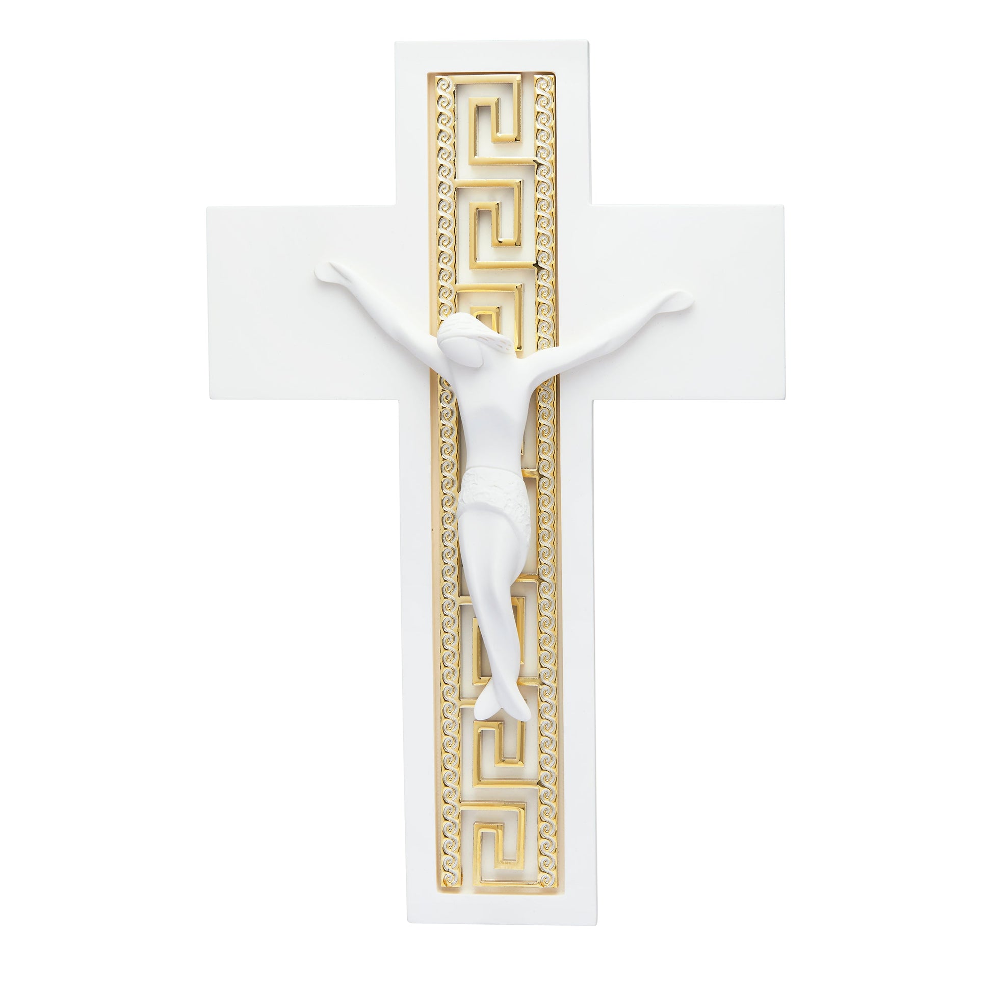 Crucifijo De Resina Blanca Con Motivo De Greca Dorado Estilo Moderno