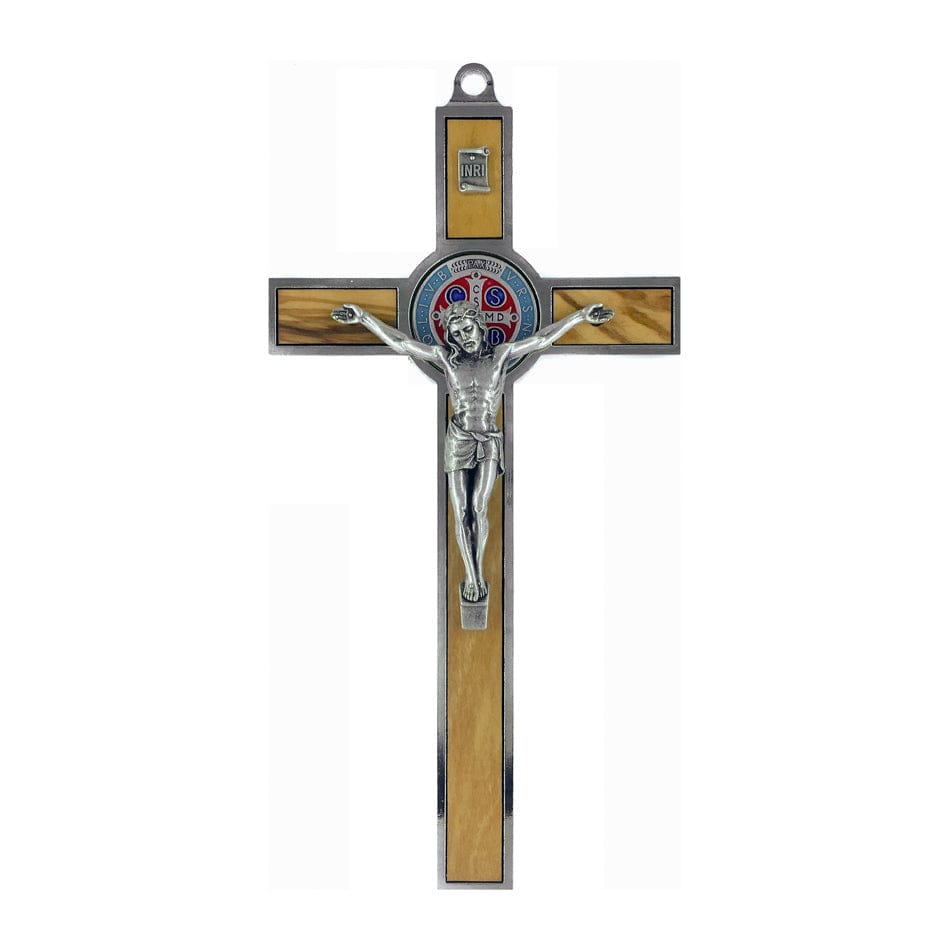 Crucifijo De San Benito De Madera De Olivo Con Medalla Coloreada Y Contorno Metálico