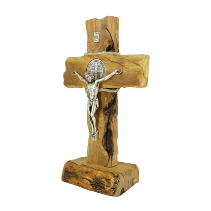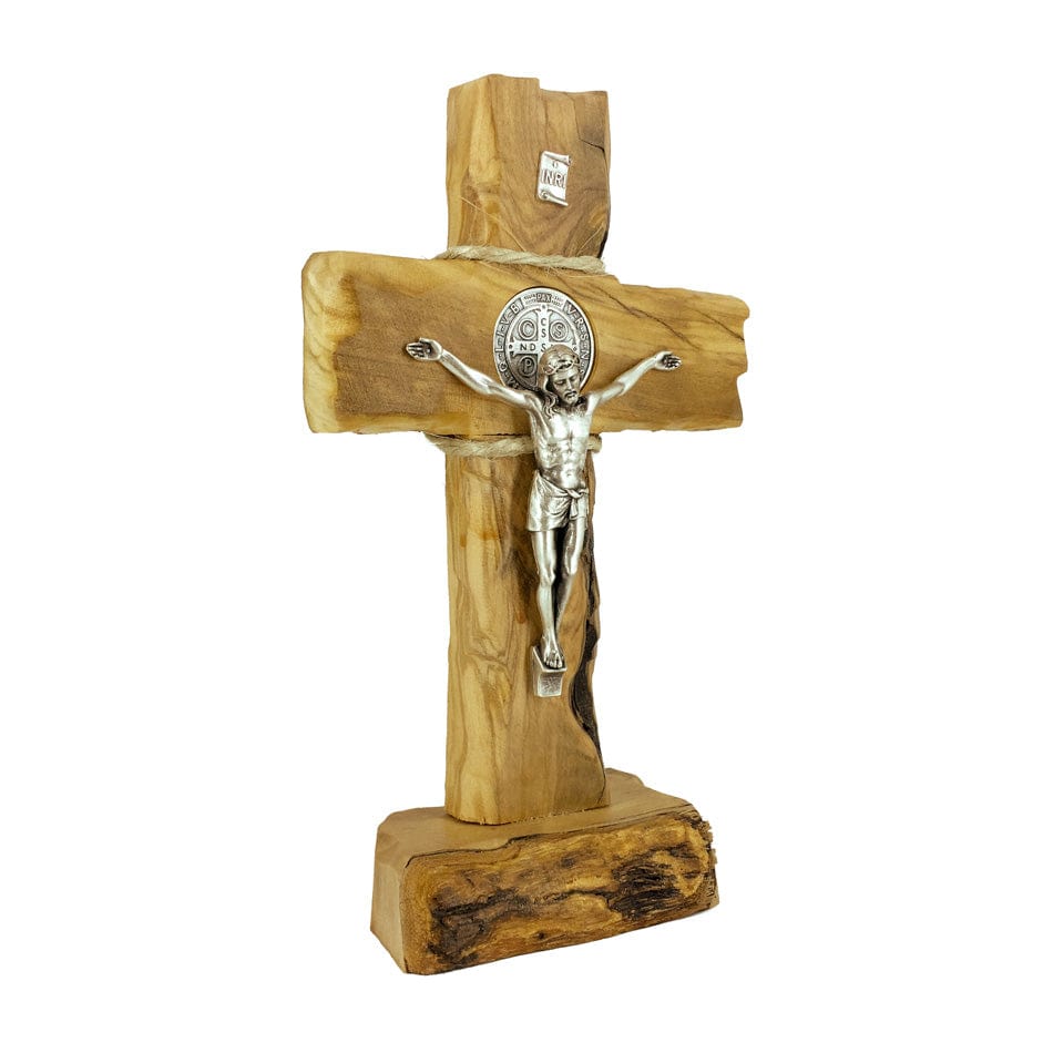 Crucifijo de madera de olivo natural de pie. Este crucifijo está hecho de madera de olivo de primera calidad, lo que lo convierte en un símbolo de fe duradero y resistente. El grano de madera natural se suma a su aspecto único y auténtico, por lo que es una hermosa adición a cualquier hogar o lugar de culto.