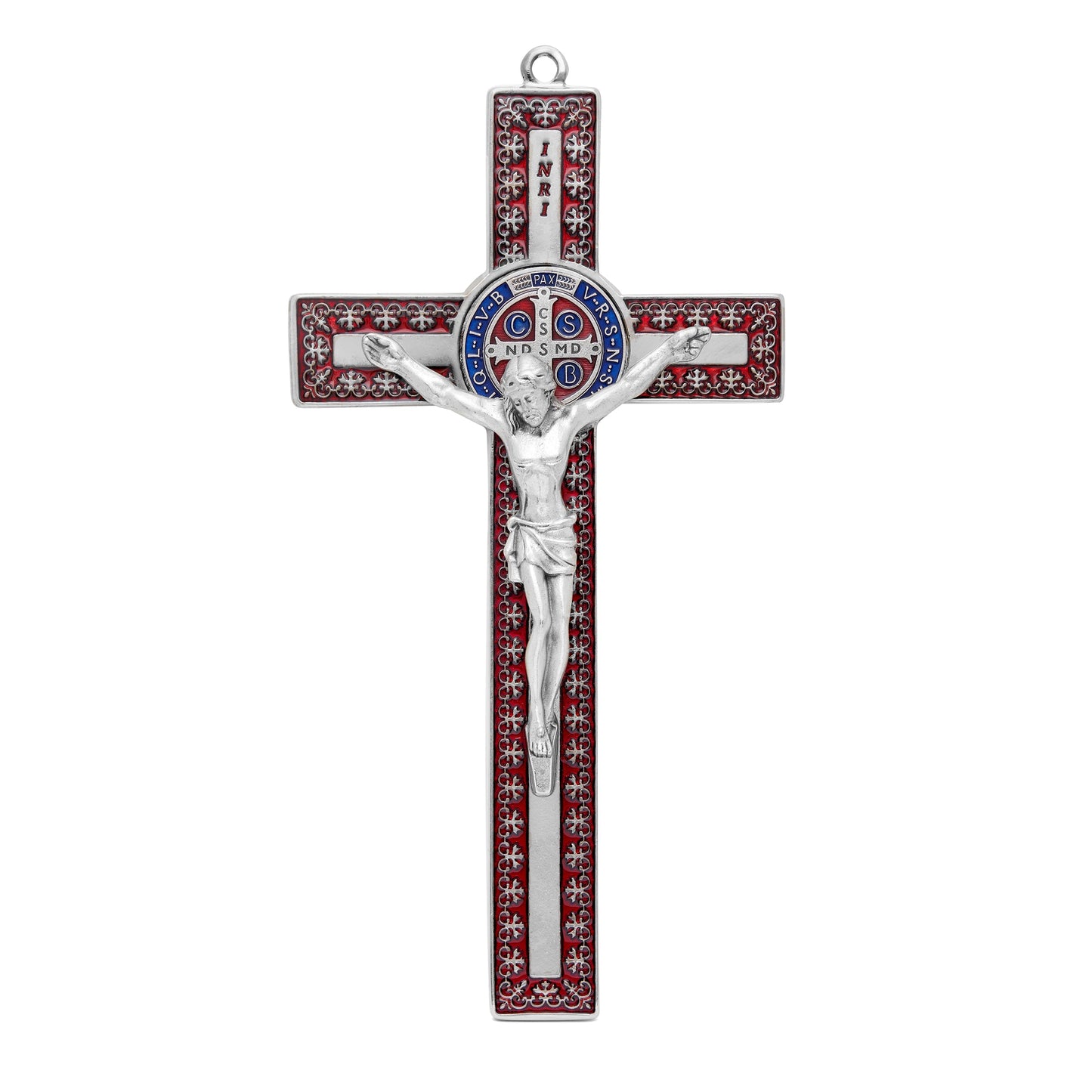 Crucifijo De San Benito De Metal Esmaltado Rojo Con Adornos
