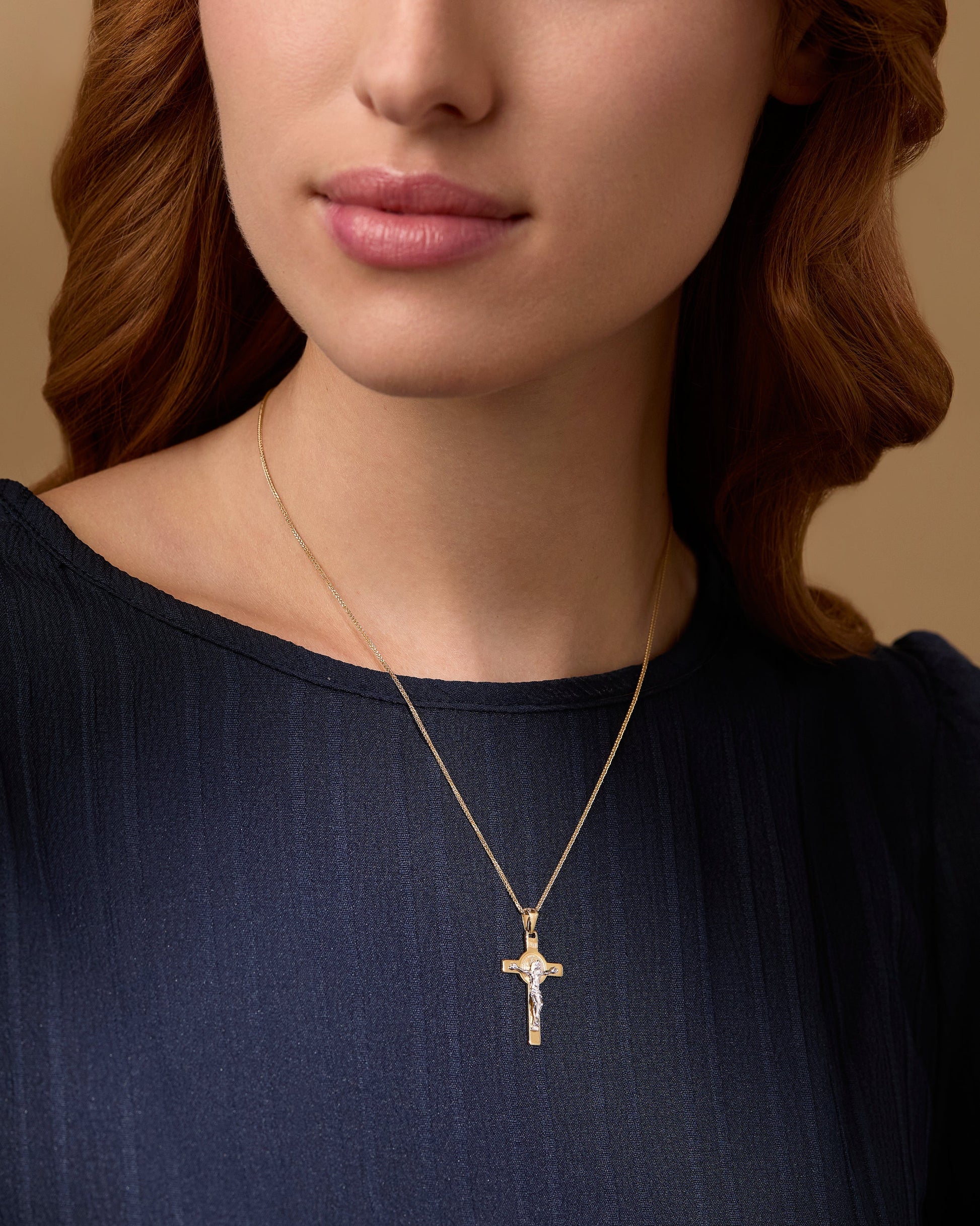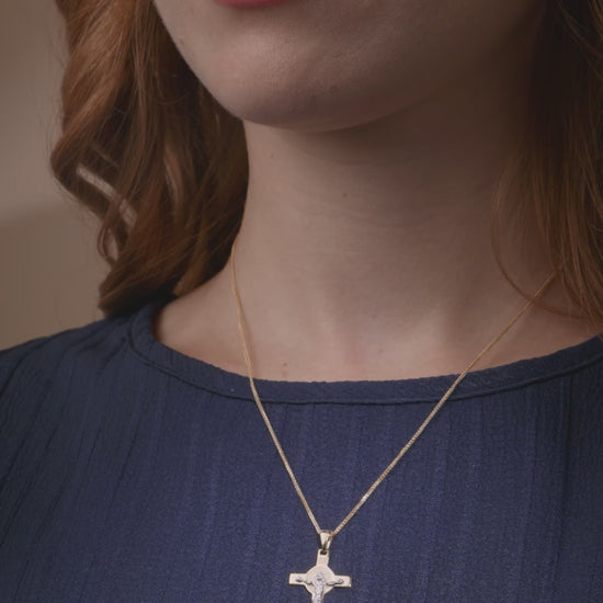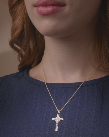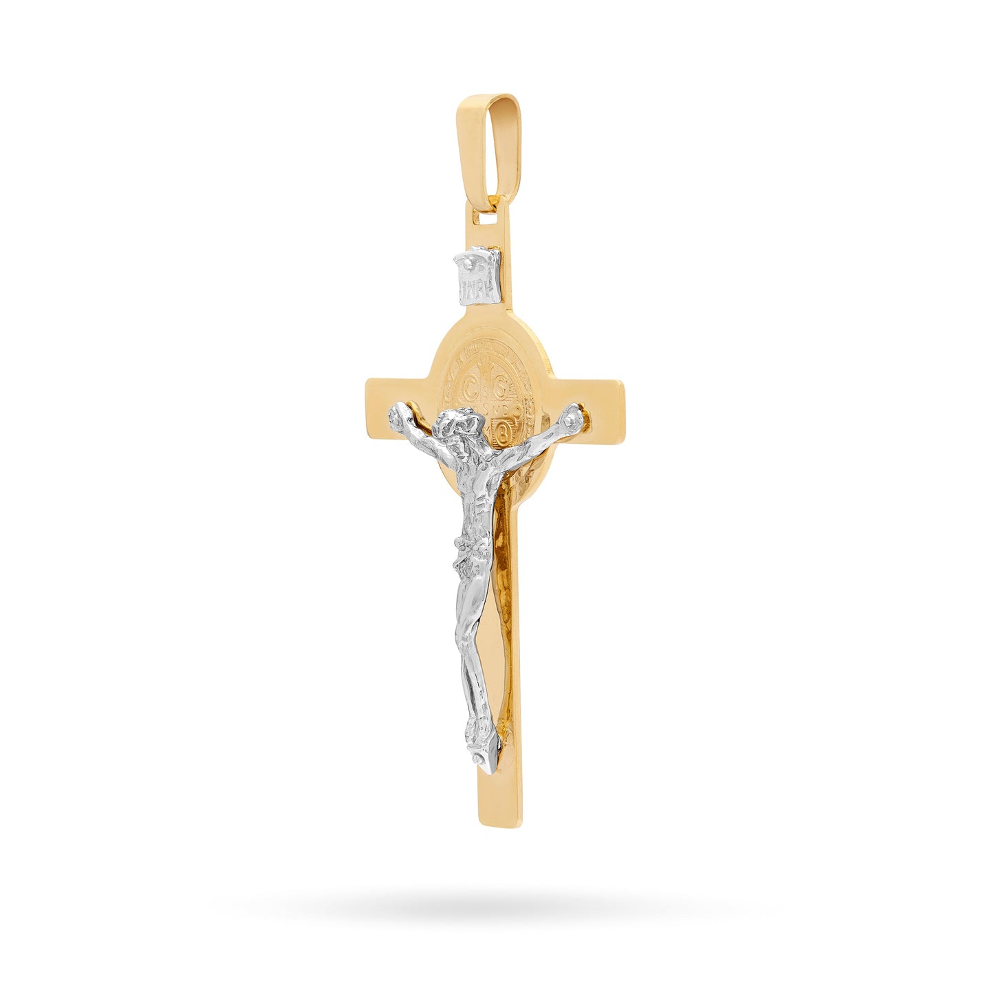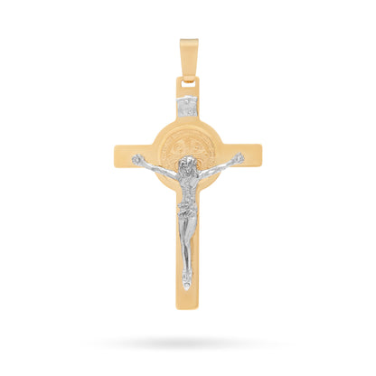 Crucifijo De San Benito Plano Colgante De Oro Amarillo Con Cuerpo De Oro Blanco