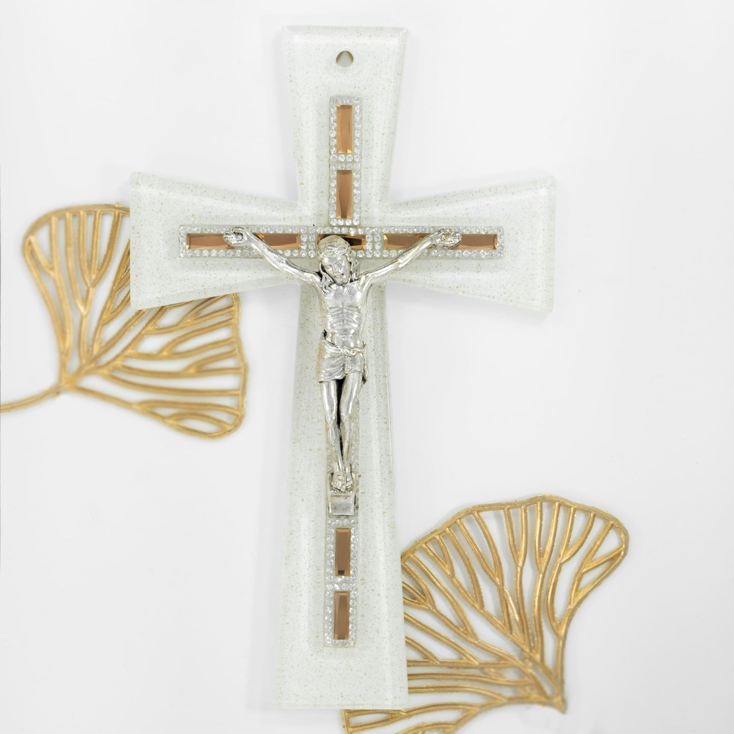 Cruz de Pared realizada en Cristal de Murano segmento vertical y horizontal caracterizado por Strass Blancos, Cuerpo diseñado en Resina Plateada.