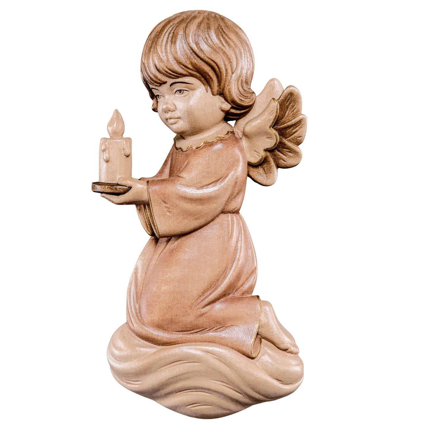 Estatua de madera Ángel Pitti con vela. Esta exquisita estatua, completamente hecha a mano en Val Gardena, proviene de la zona alpina de Alto Adige, situada en el extremo más norte de la península italiana, justo al lado de Austria.