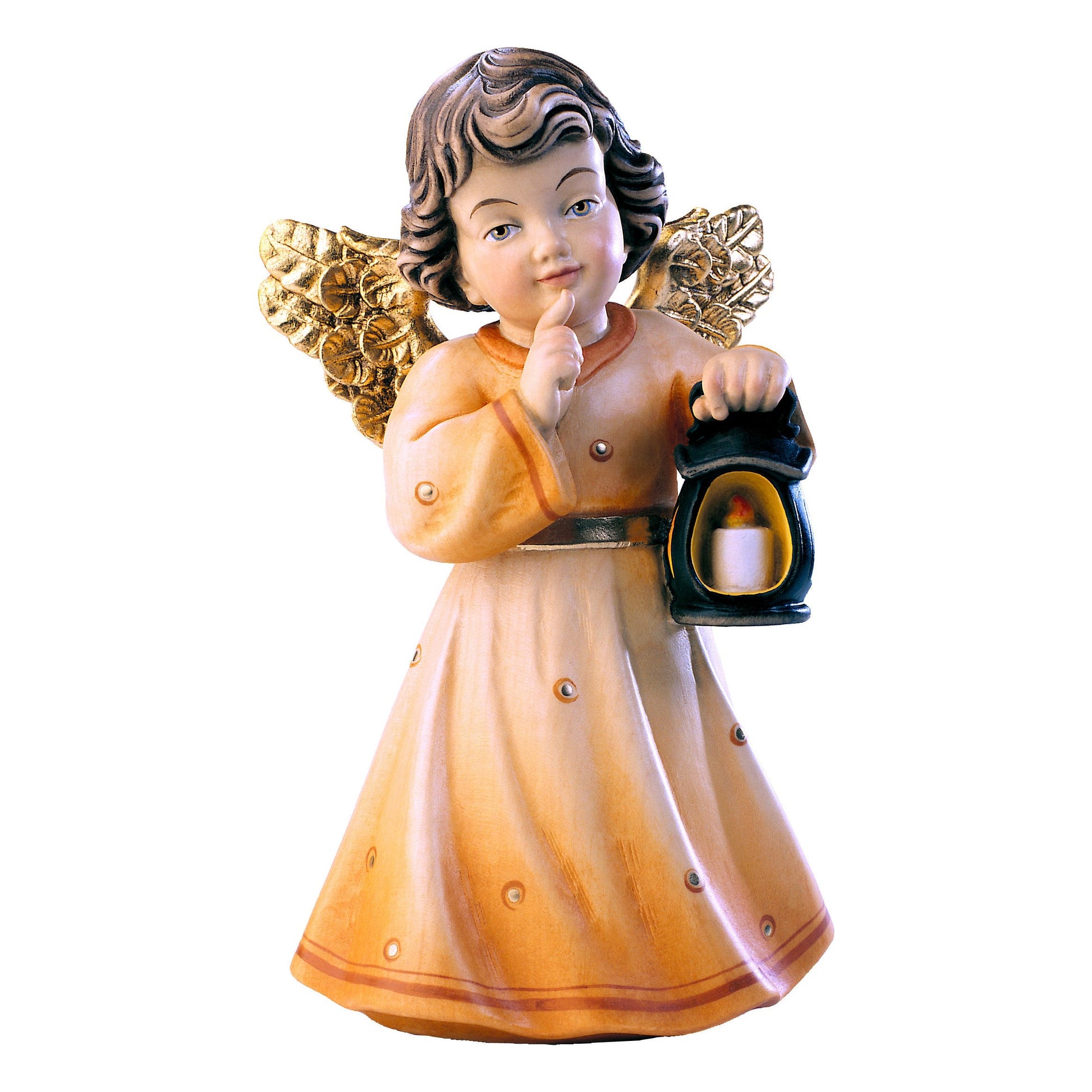 Estatua de madera Ángel Sissi con farol. Elaborada enteramente a mano en Val Gardena, esta exquisita estatua proviene de la región alpina de Alto Adige, situada en el extremo más norte de la península italiana, adyacente a Austria.