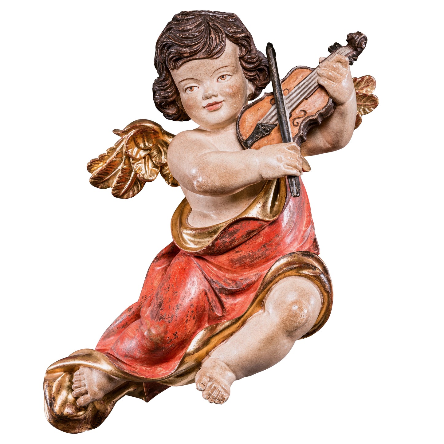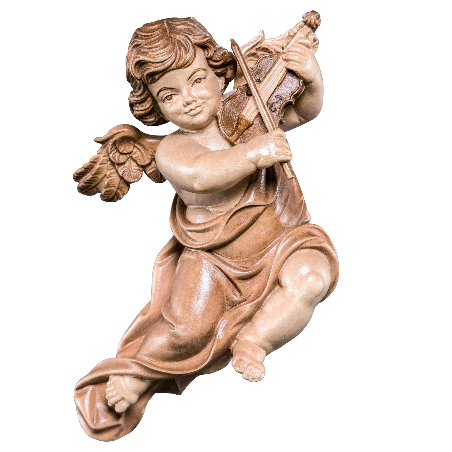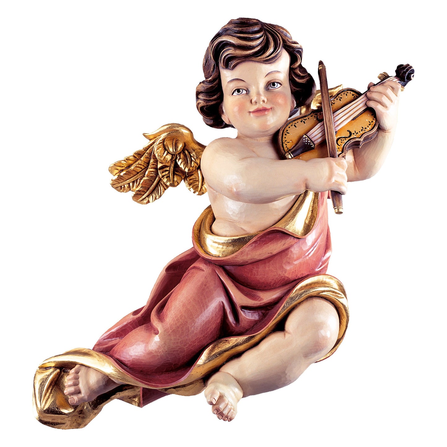 Estatua de madera Angelito mariano con violín. Elaborada completamente a mano en Val Gardena, esta espléndida estatua proviene del territorio alpino de Alto Adige, ubicado en la parte más septentrional de la península italiana, colindante con Austria.