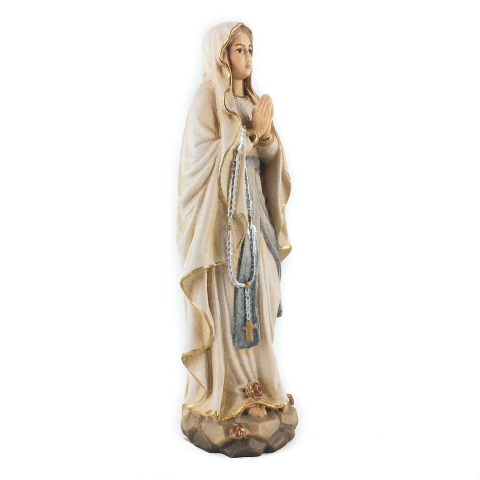 Estatua en Madera de la Virgen de Lourdes entallada a mano en el Norte de Italia. Interesantisimo detalle son las rosas en los Pies de Nuestra Señora. En una de las Aparciones, la Virgen de Lourdes exhortò a la Niña la construcción de un Sanctuario en el mismo lugar en la Gruta. Acompañada por dos de sus tías, Bernardita se dirigiò hacia la Iglesia con el special pedido. El Padre Peyramale, Parroco de Lourdes, no creia en las visiones y en los Milagros. El exigiò como prueba conocer el nombre de la Señora y ver florecer en invierno el Rosal de la Gruta.