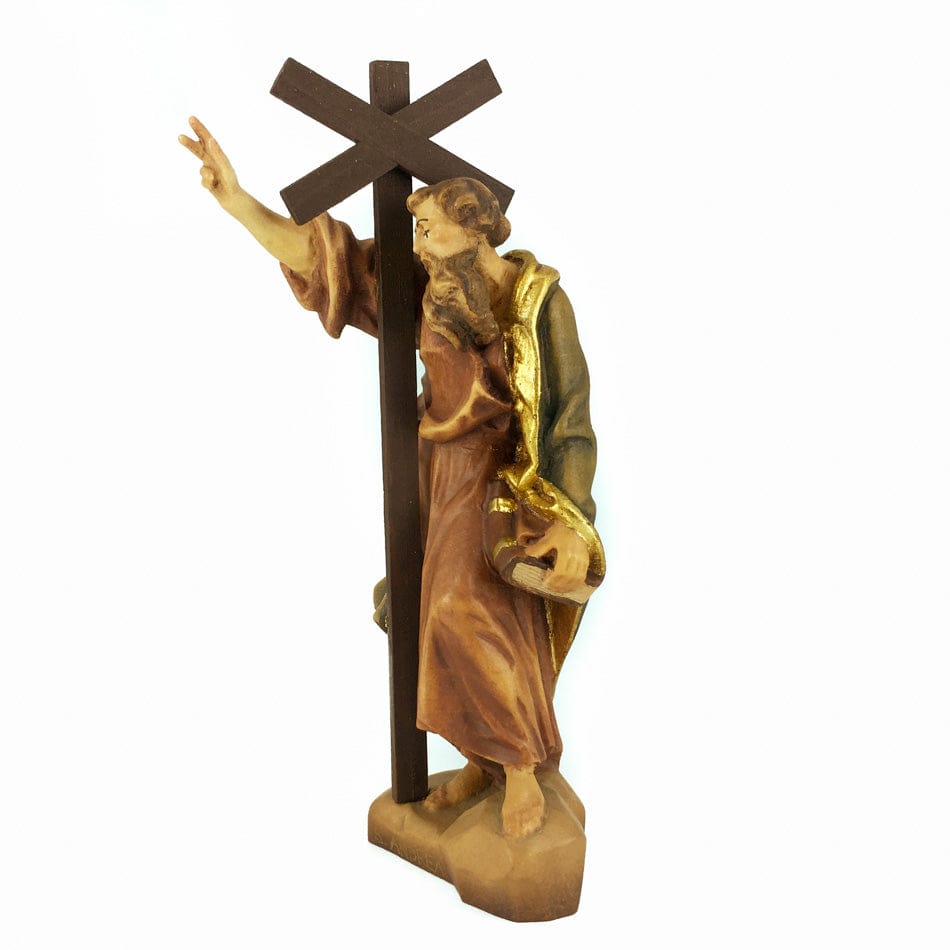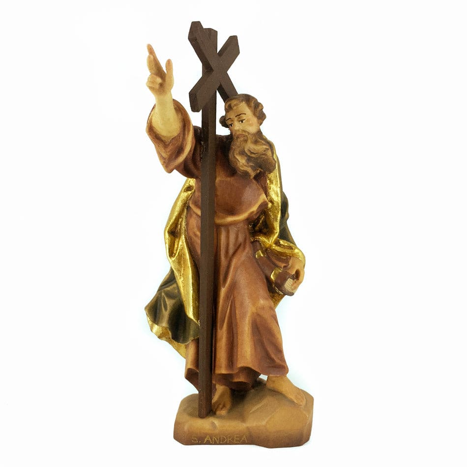 Estatua en madera de San Andrès entallada y pintada a mano en el Norte del Italia. San Andrès fue el Primer Apostol de Jesús, es conocido tambien como "el Primer LLamado", fue el Primer que reconoció Jesús como Mesias. El nombre Andrès siendo griego y no Hebreo es signo de una apertura cultural de su Familia. En los Evangelios nos hablan de Andrès como uno de los Discipulos mas vinculados a Jesús. Predicó el Cristianismo en Rusia, Grecia y Rumania. Fue crucificado sobre una Cruz Decussata, en forma de X. En el momento del Martirio, San Andres pidió de ser crucificado sobre una cruz diferente de la de Jesus, porque creia de no merecer tal honor.