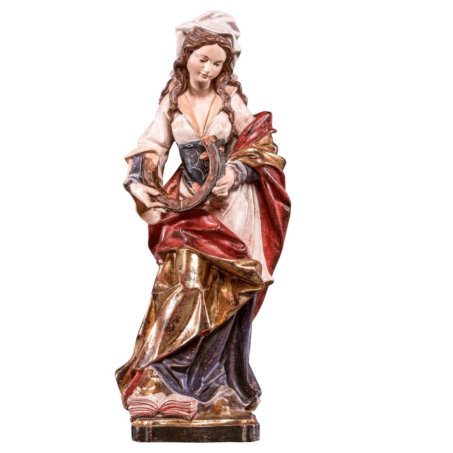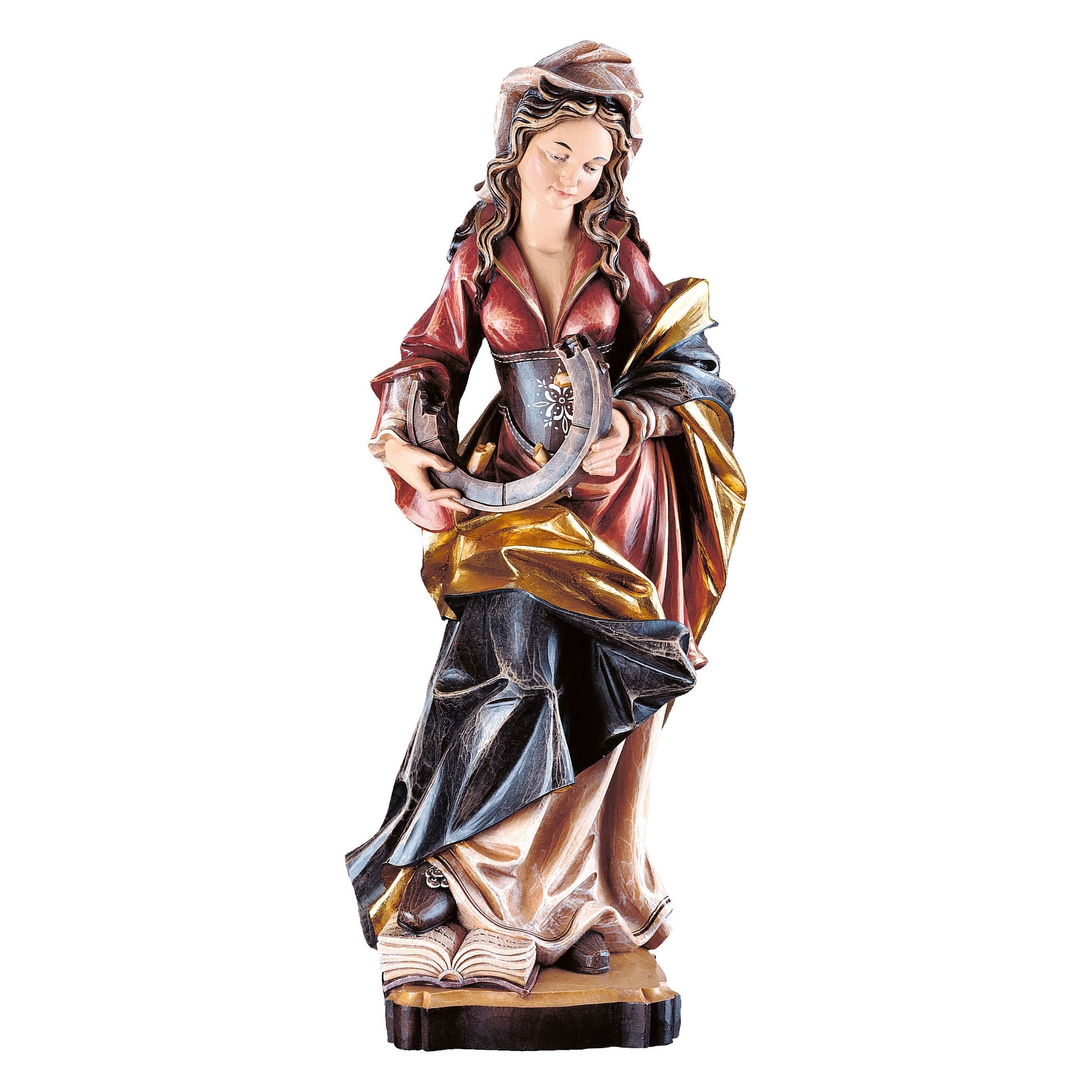 Estatua De Madera De Santa Catalina. Elaborada completamente a mano en Val Gardena, esta espléndida estatua proviene del territorio alpino de Alto Adige, ubicado en la parte más septentrional de la península italiana, colindante con Austria.