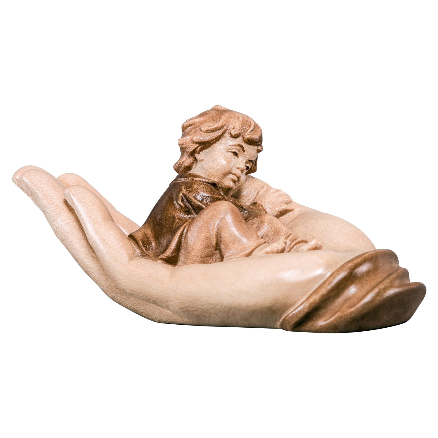 Estatua de madera Mano protectora extendida con niño. Elaborada enteramente a mano en Val Gardena, esta exquisita estatua proviene de la región alpina de Alto Adige, situada en el extremo más norte de la península italiana, adyacente a Austria.