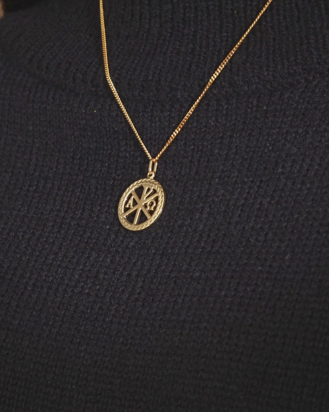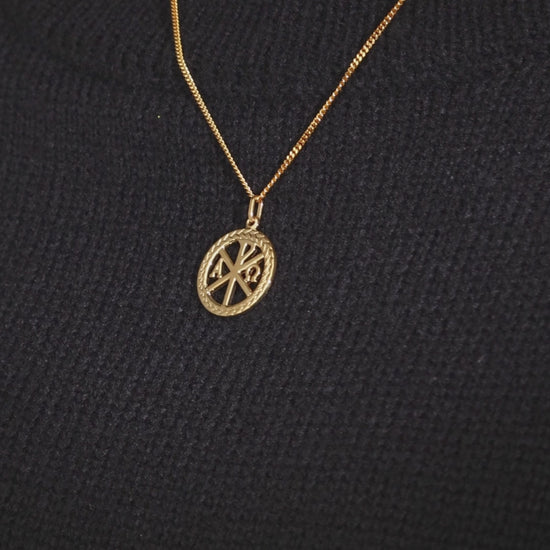 Simple Medalla en Plata 925 bañada de Oro Amarillo 18K. En este símbolo cristiano encontramos el Crismón (Chi Ro) acompañado por las letras griegas Alfa y Omega que expresan el concepto de la Eternidad de Jesú como Principio y Fin de todas las cosas.