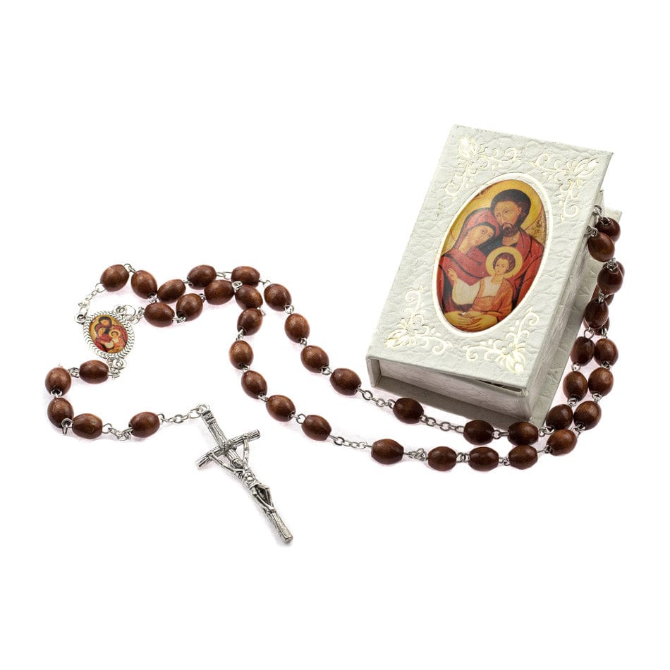 Cajita portarosariera y rosario en madera de la Sagrada Familia, medalla central con la Santa Familia, cruz Pastoral.