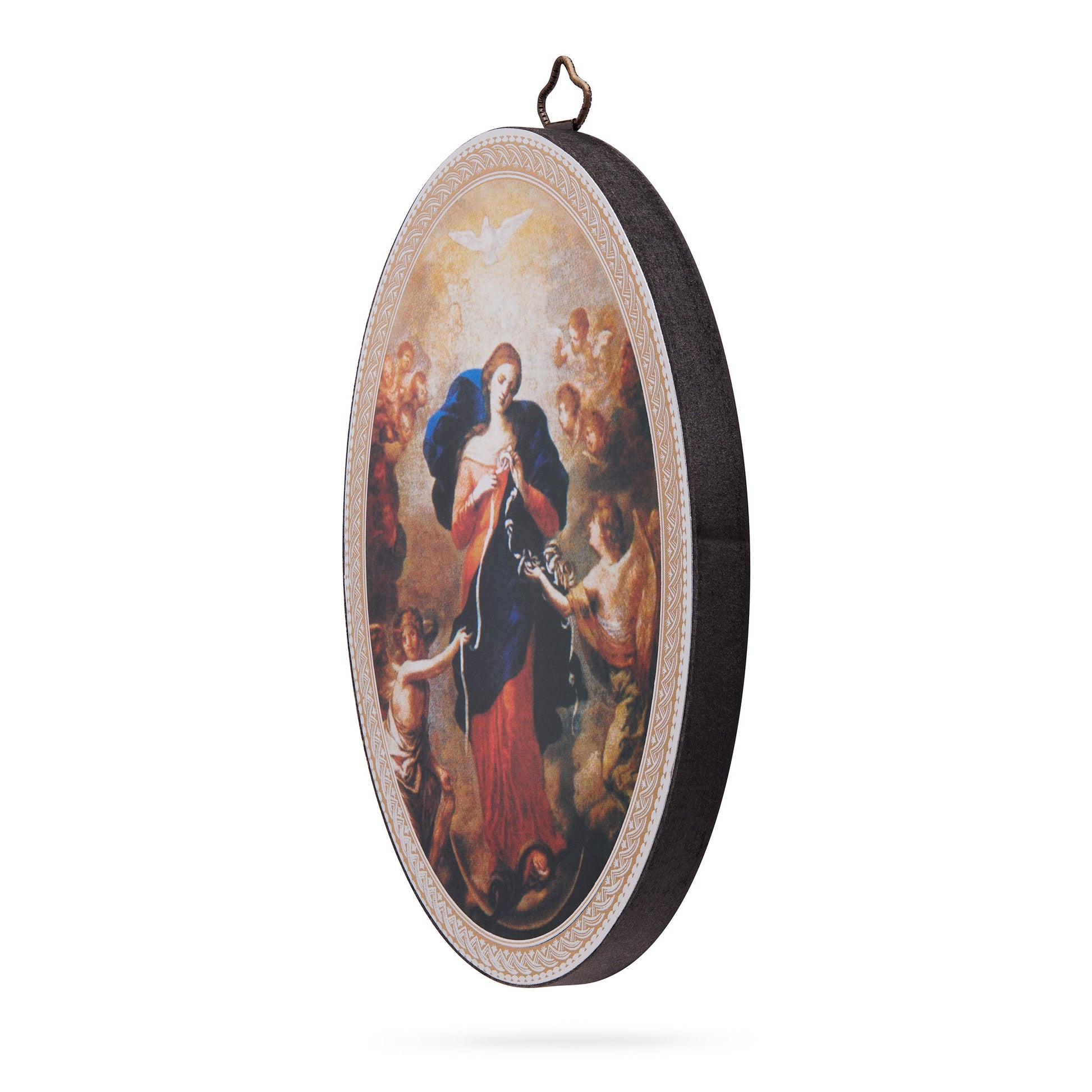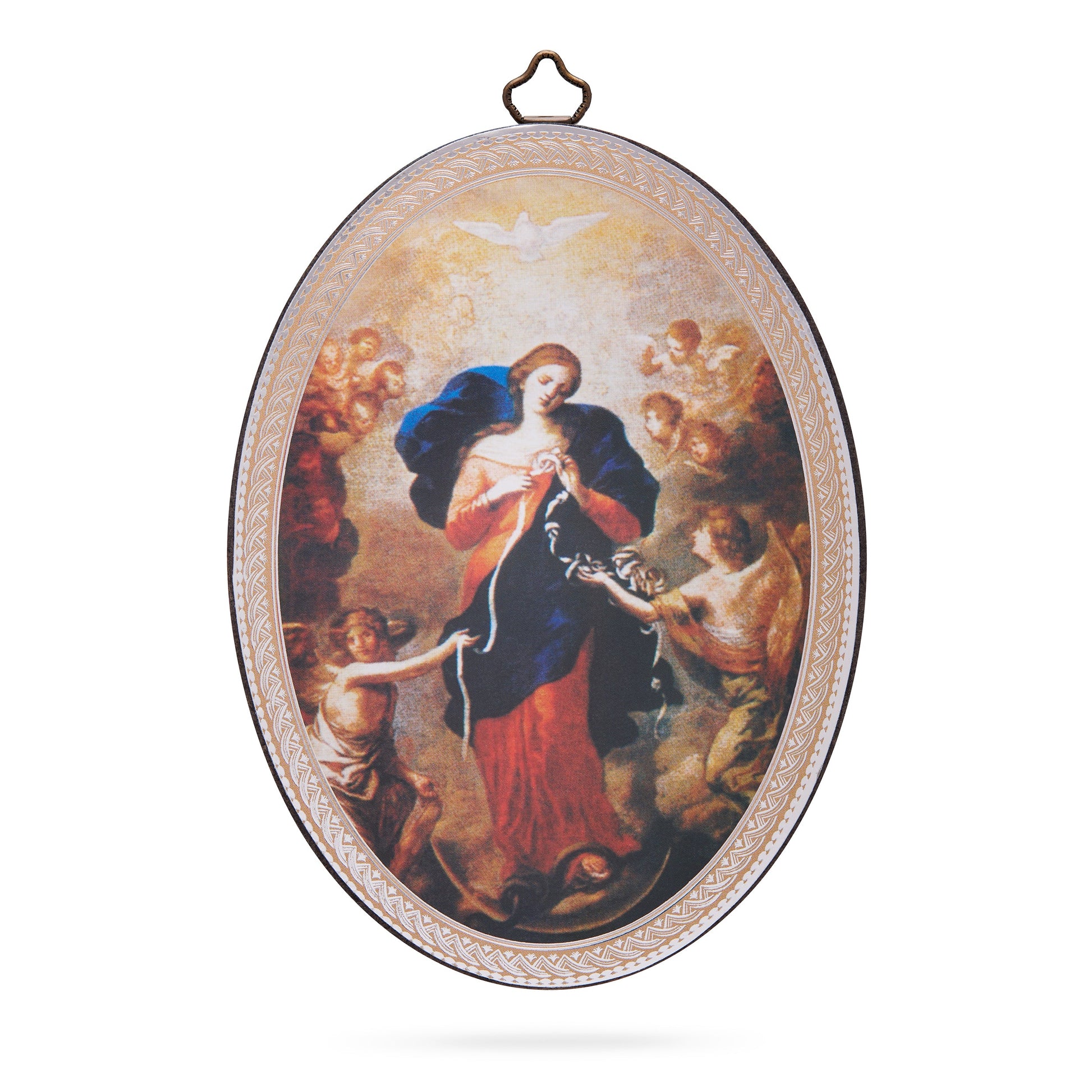 Icono ovalado que representa a María deshaciendo nudos en papel de plata sobre una base de madera.
