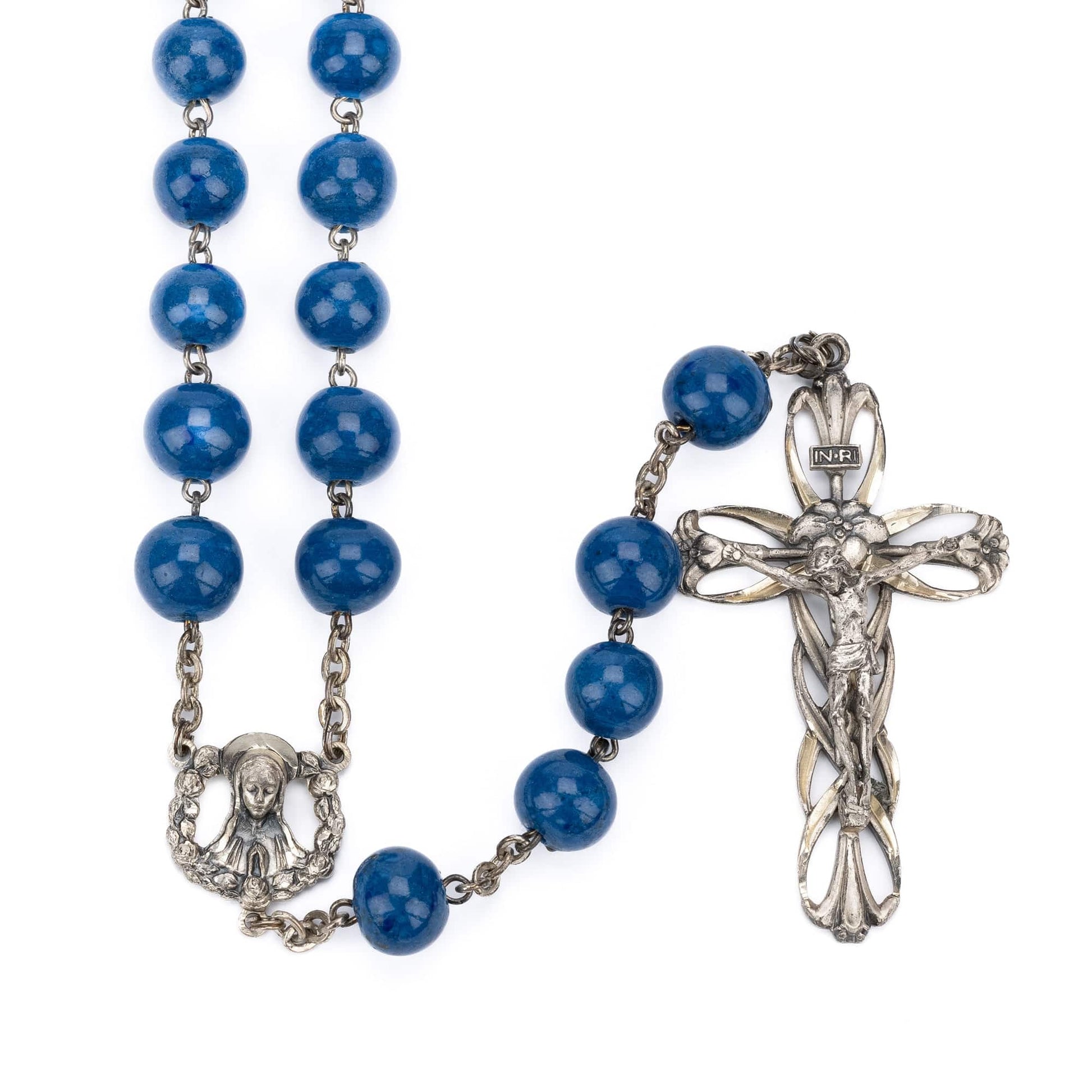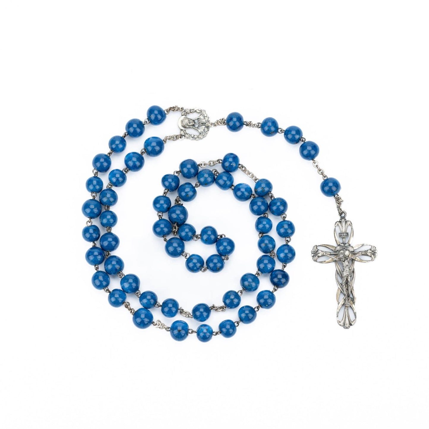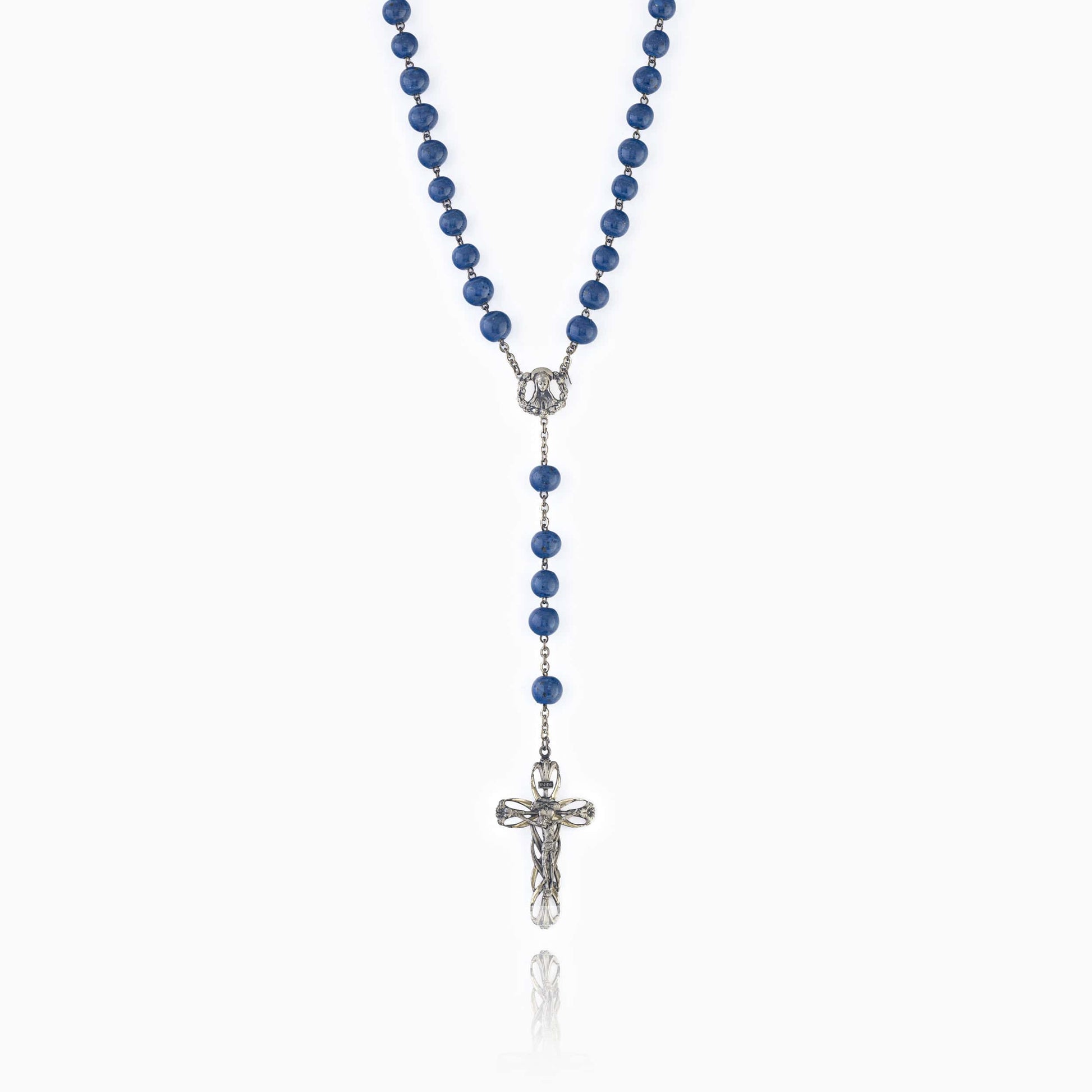 Este rosario de plata está hecho con cuentas de lapislázuli de 10 mm. La Virgen María está representada en la pieza central y la cruz de plata está hecha a mano.