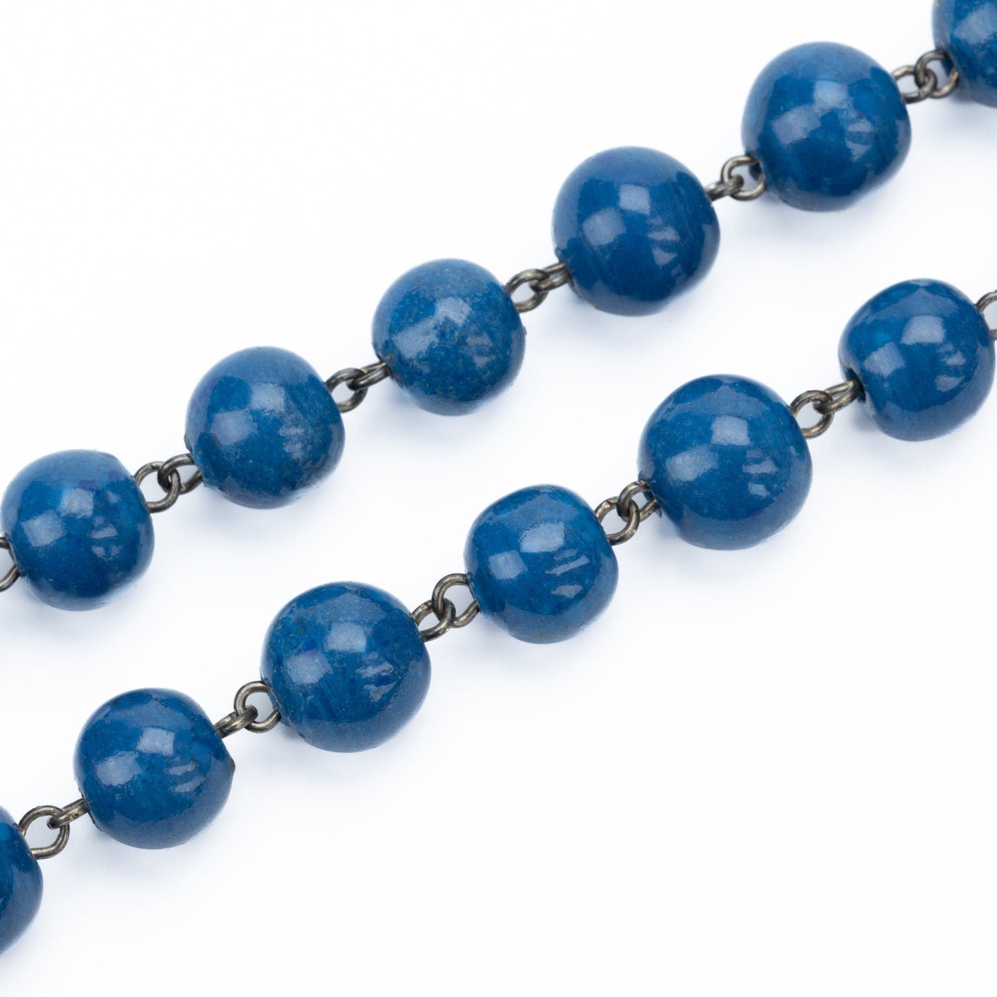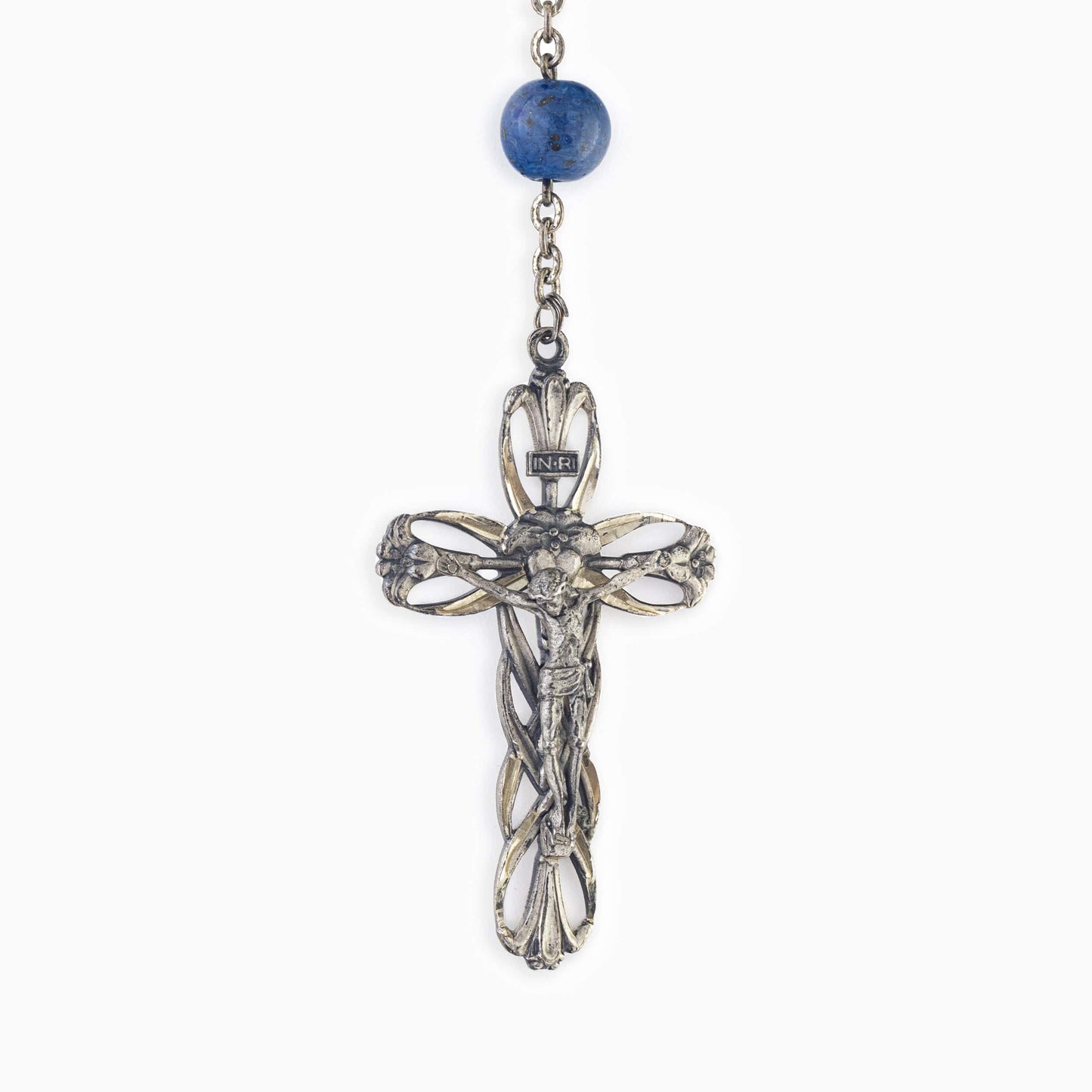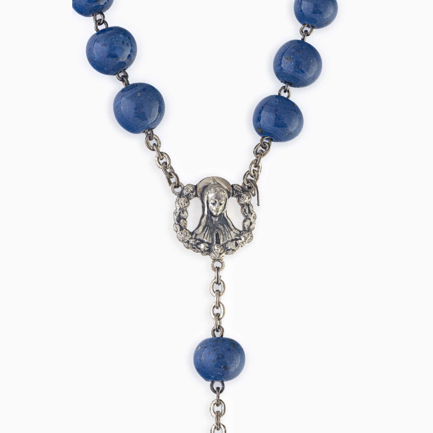 Este rosario de plata está hecho con cuentas de lapislázuli de 10 mm. La Virgen María está representada en la pieza central y la cruz de plata está hecha a mano.