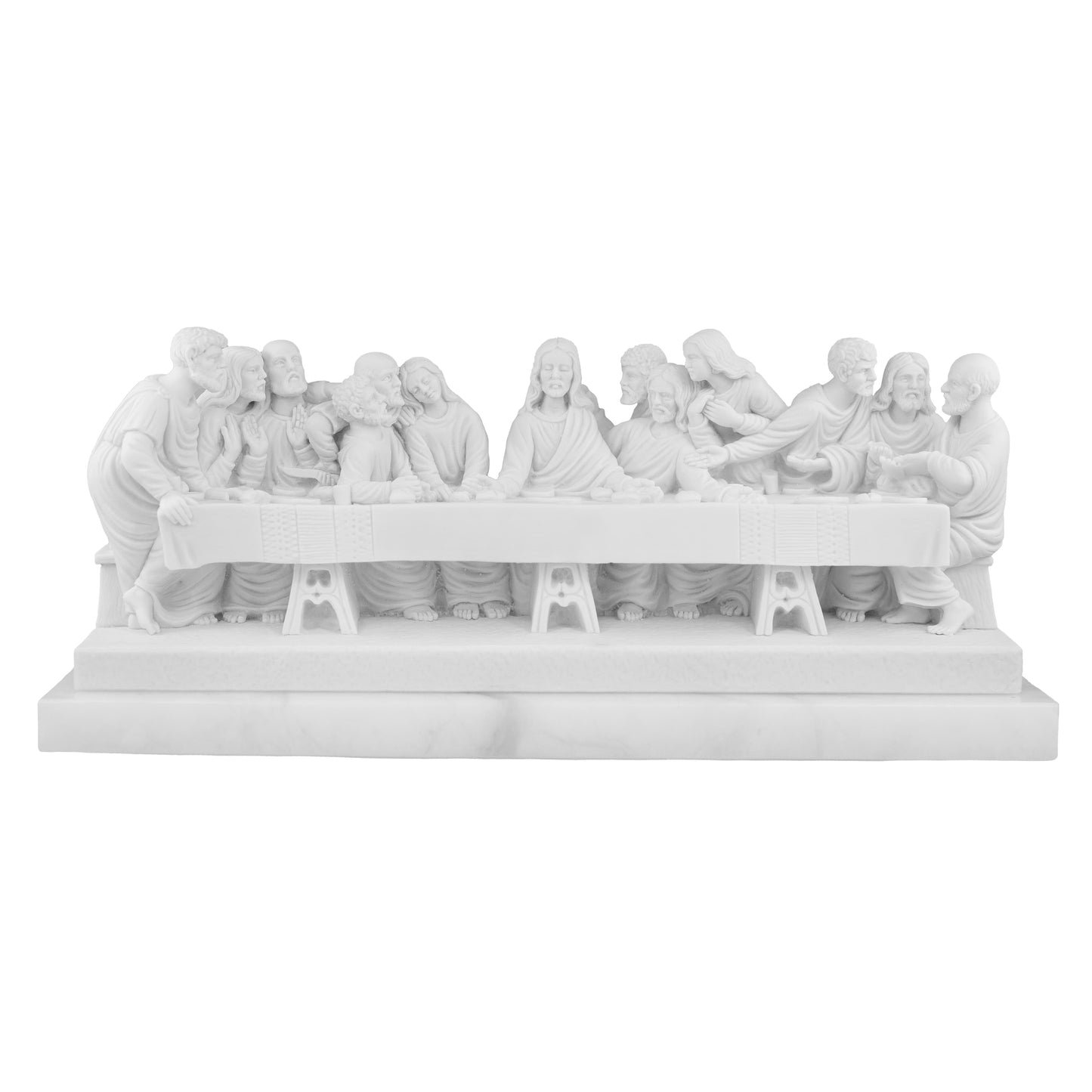 Estatua en polvo de mármol. Una obra maestra de Leonardo da Vinci, el Cenáculo. Posicionado en el centro de la mesa, la figura de Cristo domina la escena. En la parte izquierda de la pintura podemos ver los Santos Apóstoles, Bartolomé, Jacobo el Menor y Andrés, Pedro, Juan y Judas Iscariote. A la derecha, pasada la imagen entronizada de Cristo, Jacobo el Mayor, Felipe, Tomás, Mateo, Judas Tadeo y Simón. El significado de esta representación artística no solo es la traición, sino también la oferta de Jesús al hombre a través de la Eucaristía.