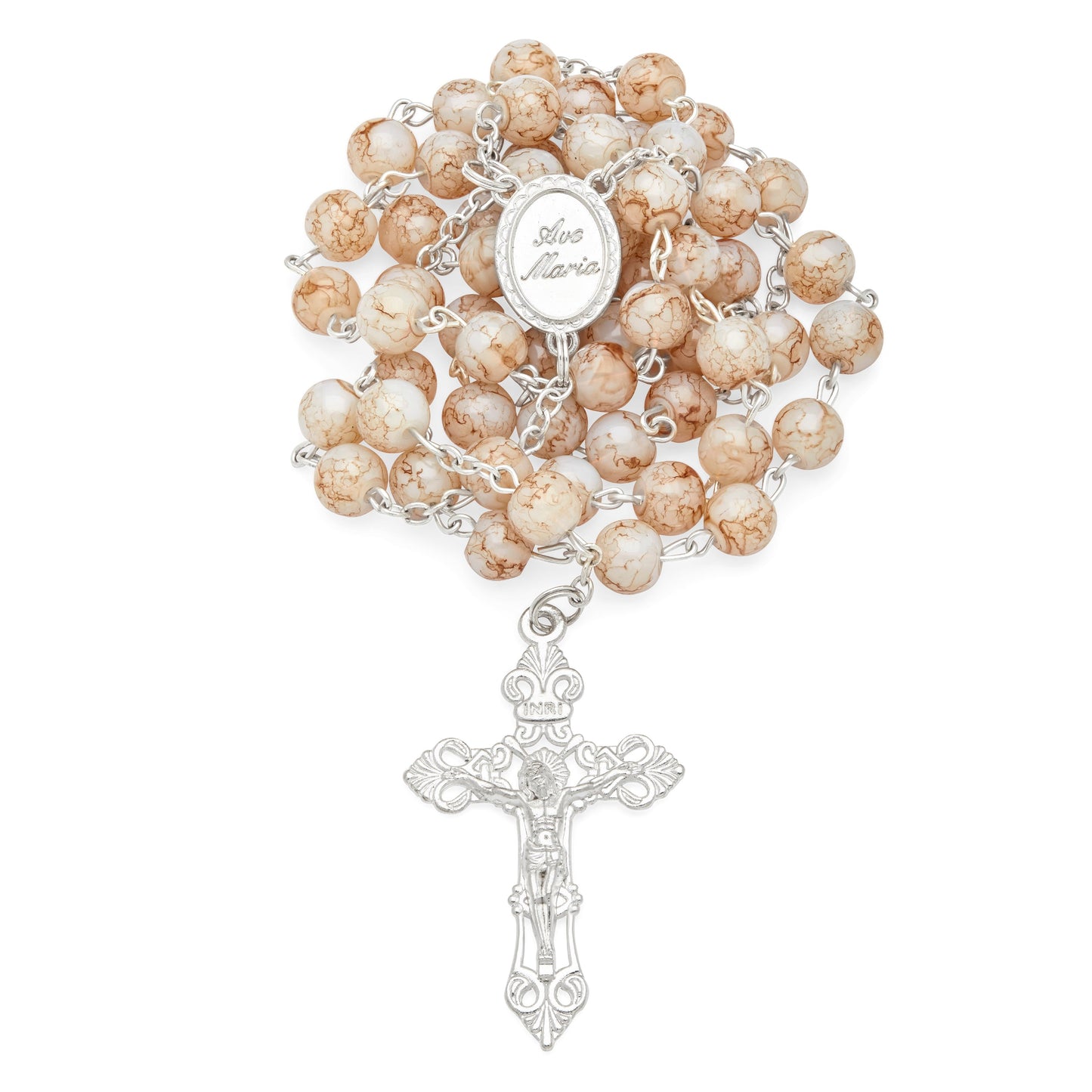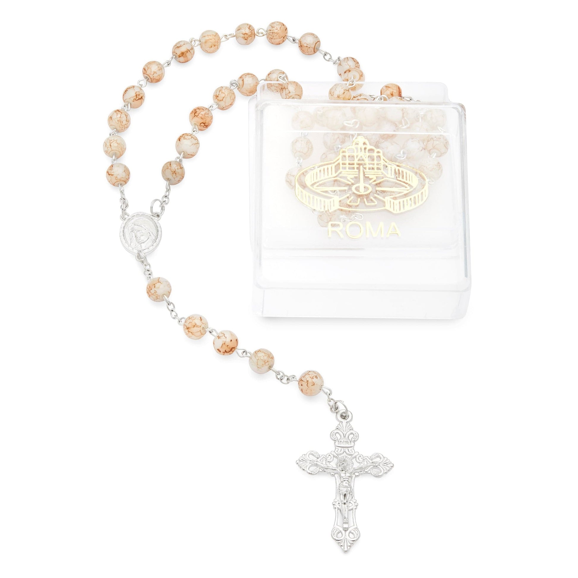 Caja blanca con símbolo de la Paz que contiene rosario redondo de perlas blancas de 6 mm, cruz del Papa Francisco, cruz del Buen Pastor.