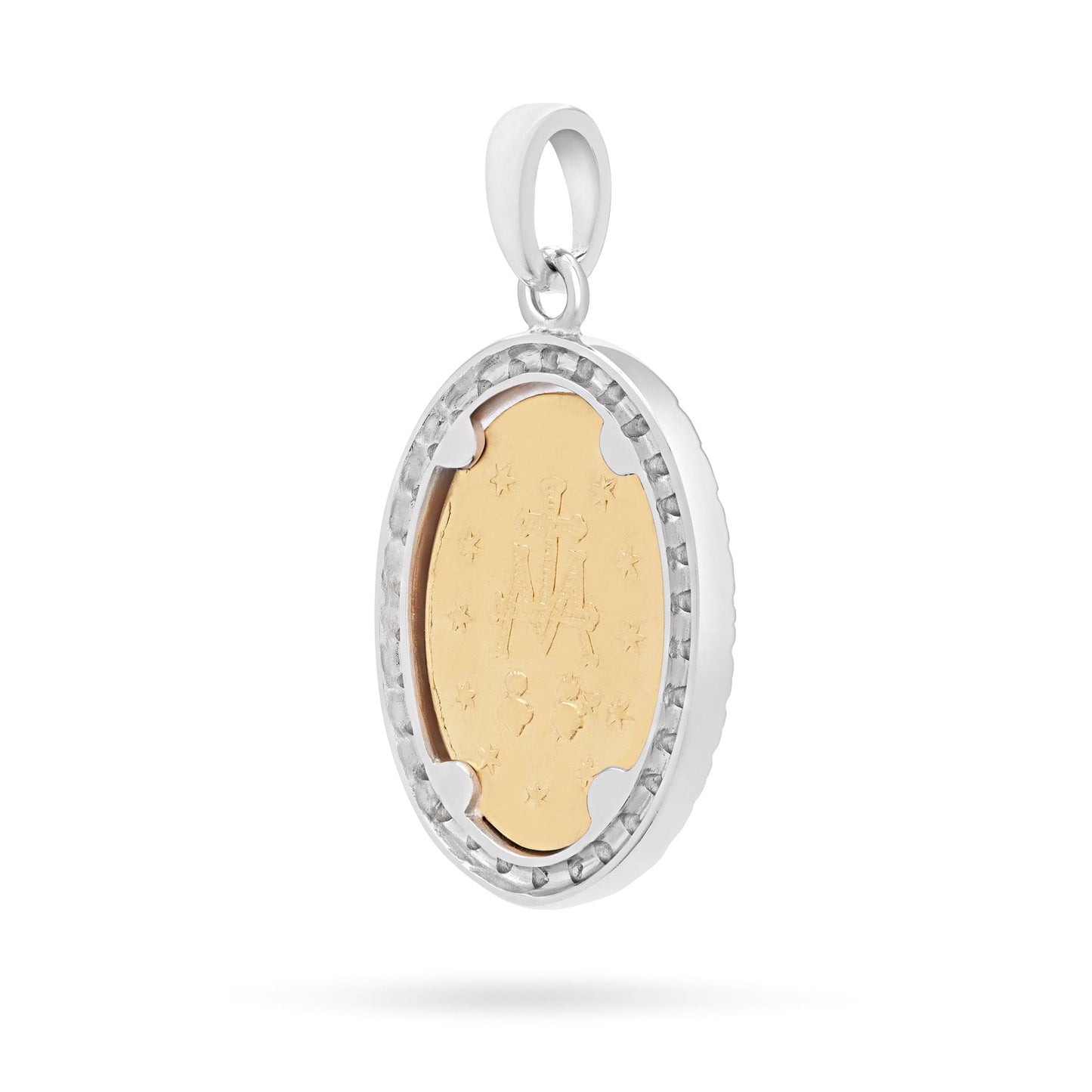 Medalla de la Milagrosa realizada en Oro Amarillo y Blanco 18K con Zircones Blancos. Replica perfecta de la Medalla Milagrosa encargada por la Santisima Virgen a Santa Catalina Labourè durante una aparicion Mariana. Símbolo de devoción, Amor y Fe.