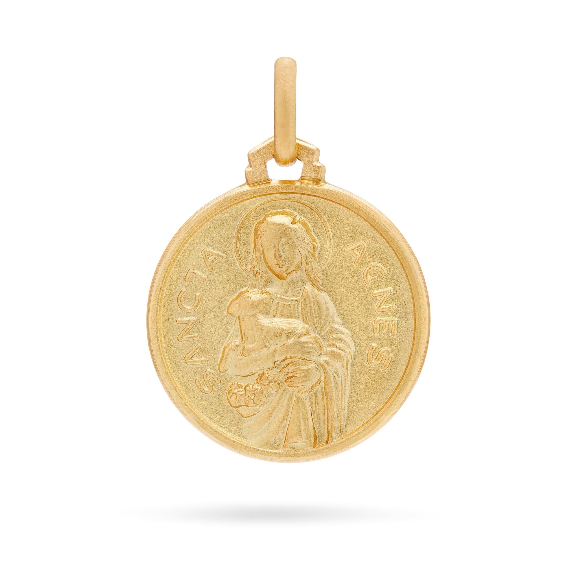 Medalla de Oro Amarillo 18K de Santa Inés de Roma. Inés de Roma fue una virgen romana, que sufrió el martirio, durante la persecución de Diocleciano. Es venerada como una de las grandes mártires de la historia de la Iglesia. Patrona de las jóvenes, las novias, los jardineros y de las prometidas en matrimonio.