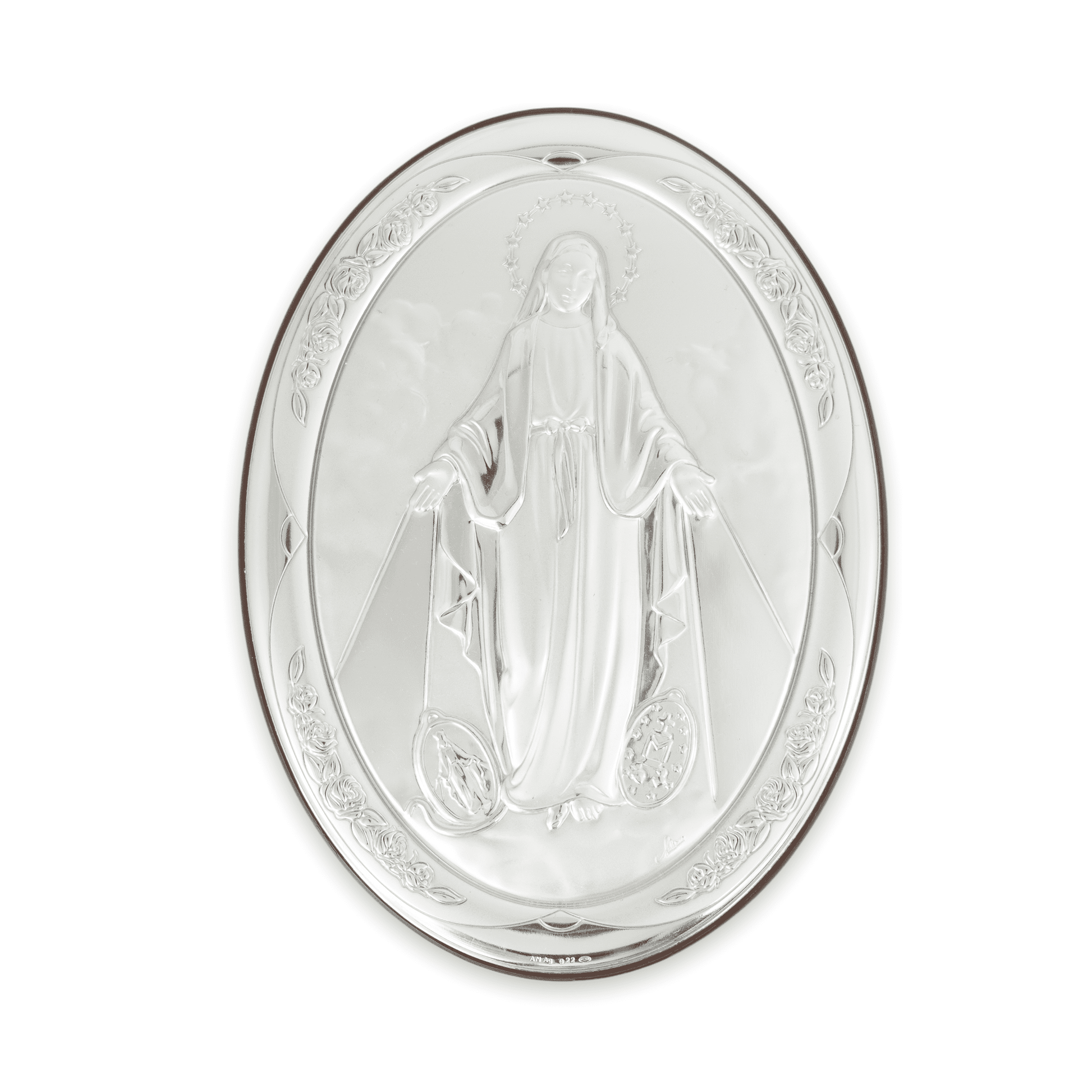 Cuadro ovalado representando la Virgen Milagrosa en Plata de Ley 925 bilaminada sobre base de madera. El relieve de esta imagen representa la primera aparición de la Virgen a Catalina Labouré. Desde aquí la historia de la Medalla Milagrosa, la cual será un inmenso símbolo de gracia, para aquellos que la llevarán con confianza. El cuadro se puede tanto colgar de la pared como apoyar sobre una superficie. Disponible en dos tamaños diferentes.