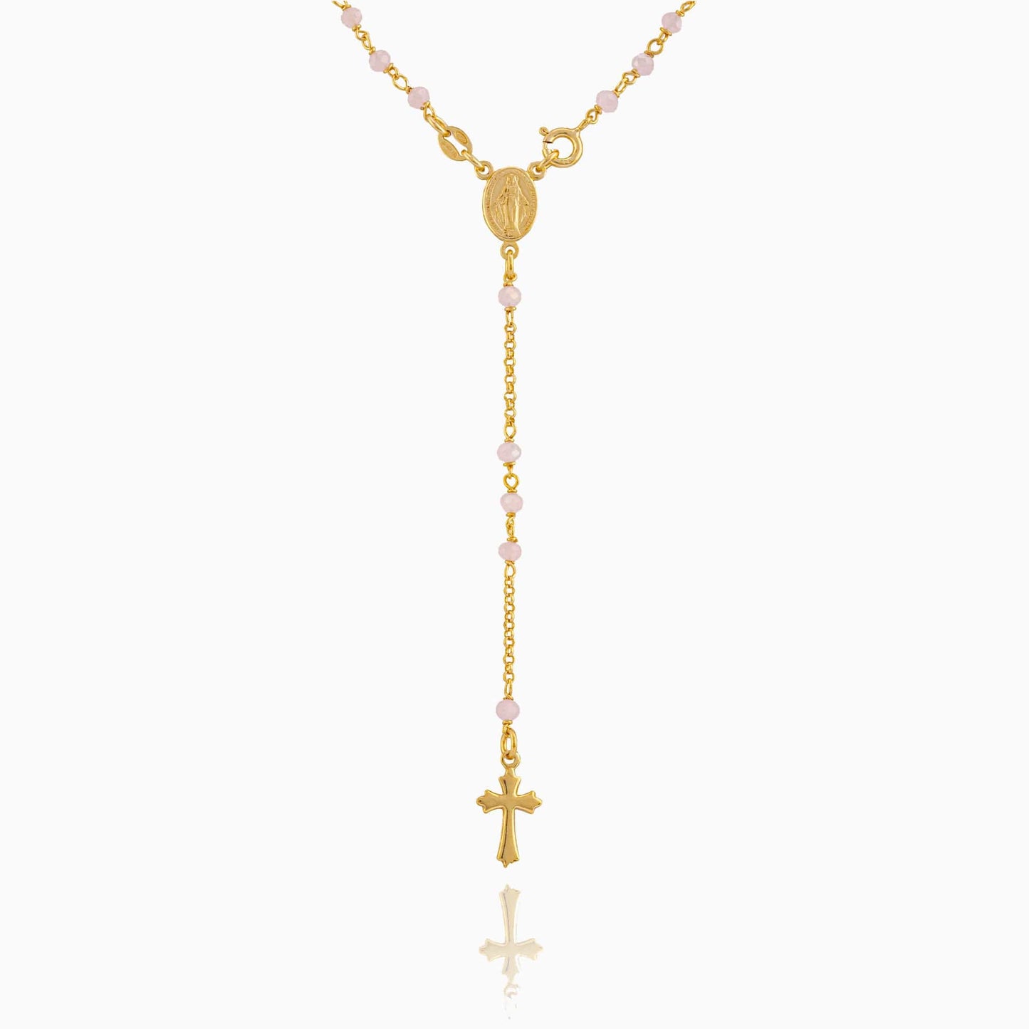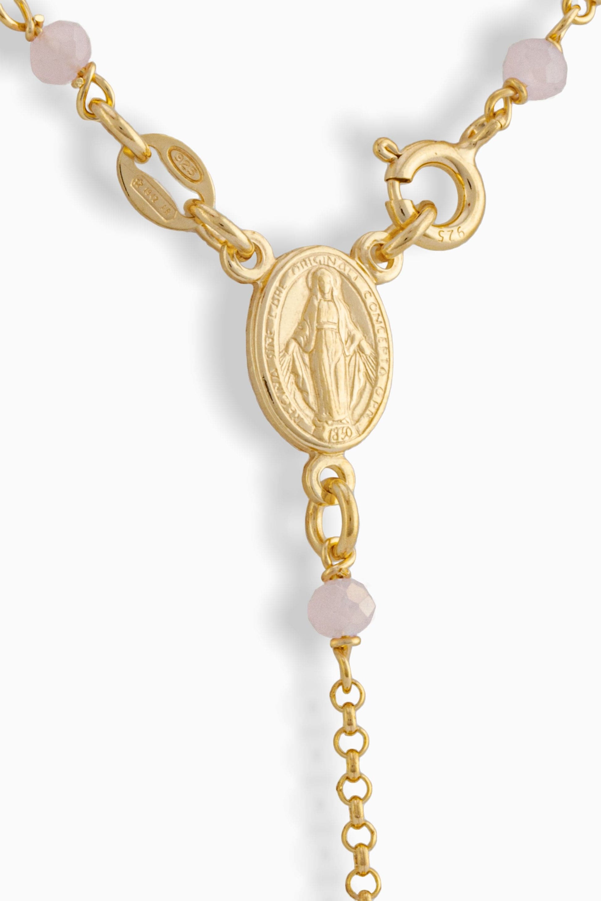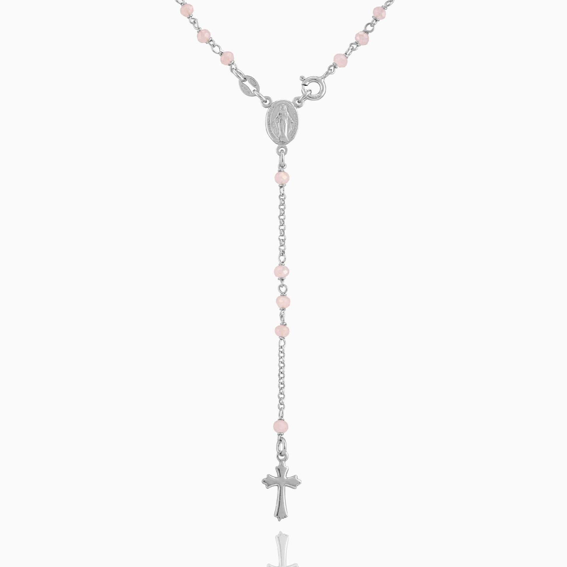 Rosario de plata de 925, las cuentas son de color rosa, con pieza central de María Milagrosa. Tanto la pieza central como la cruz son de plata.