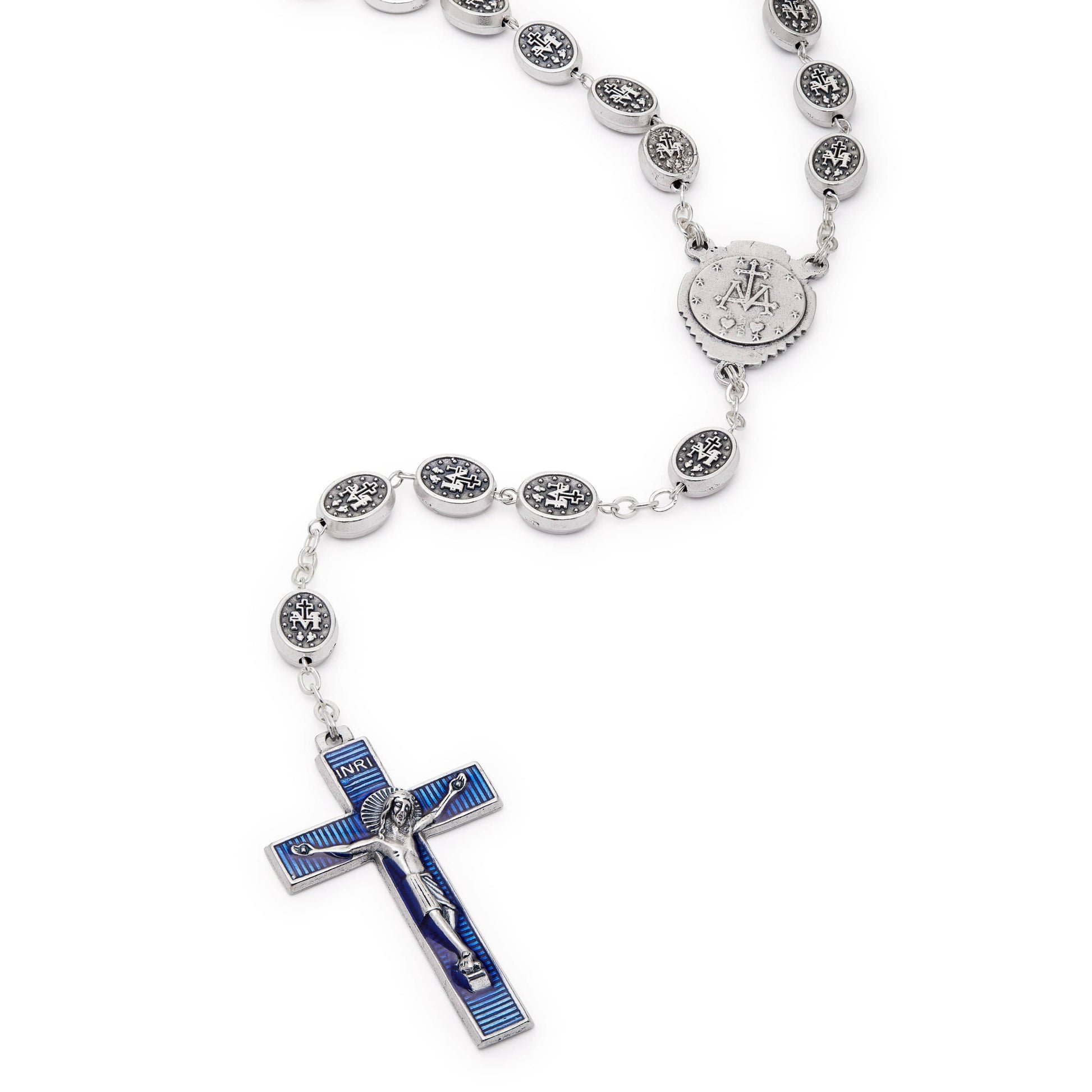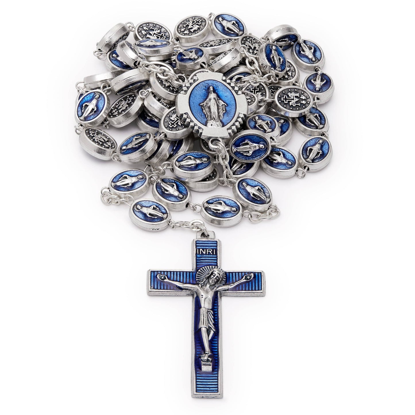 Hermoso Rosario formado por 59 cuentas de laMedalla Milagrosa. Todas las cuentas son de zamak con fondo azul esmaltado. Elesmalte está bien trabajado y aplicado con precisión en las cuentas. Lascuentas miden 8 mm aproximadamente. Todas las cuentas de la Medalla Milagrosaestán enhebradas con una fuerte cadena metálica. El Rosario es pesado, pero escómodo para rezar. El fondo esmaltado del crucifijo combina a la perfección conla pieza central de la Medalla Milagrosa.