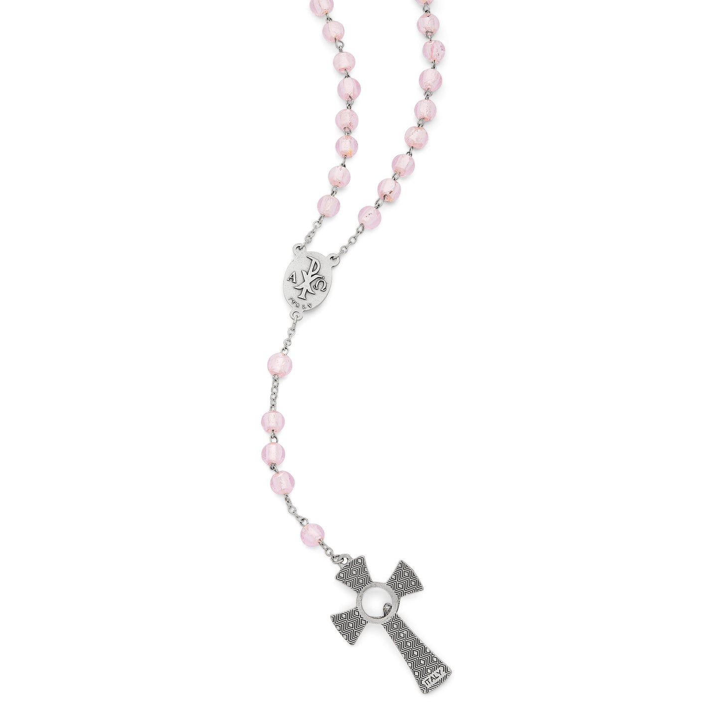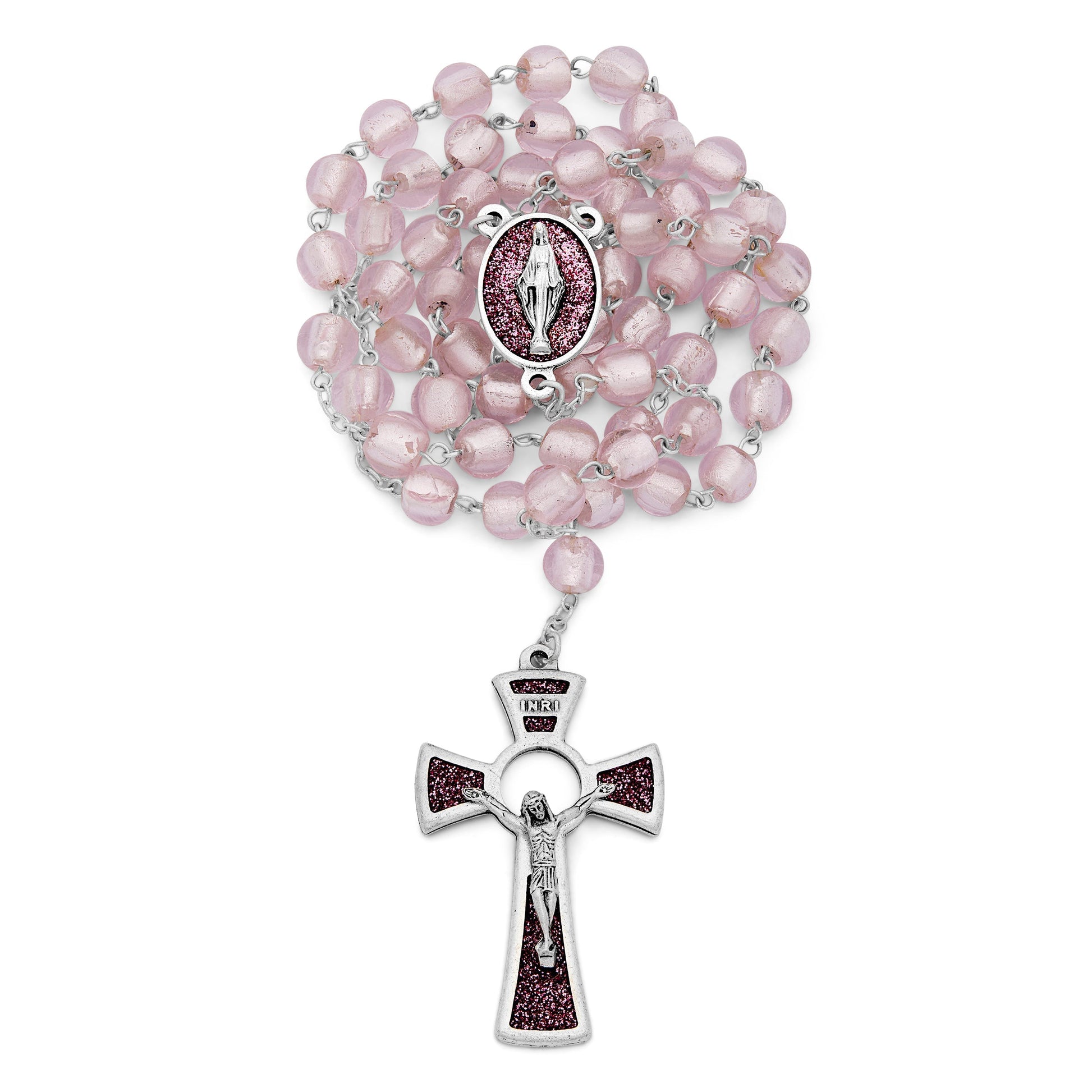 Rosario en vidrio de Murano, medalla central gliterada de la Virgen Milagrosa, cruz gliterada.