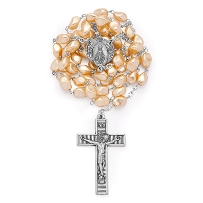 Rosario en cuentas de vidrio perlado, bolas irregulares, medalla central de la Virgen Milagrosa con en el lado algunas florecitas.