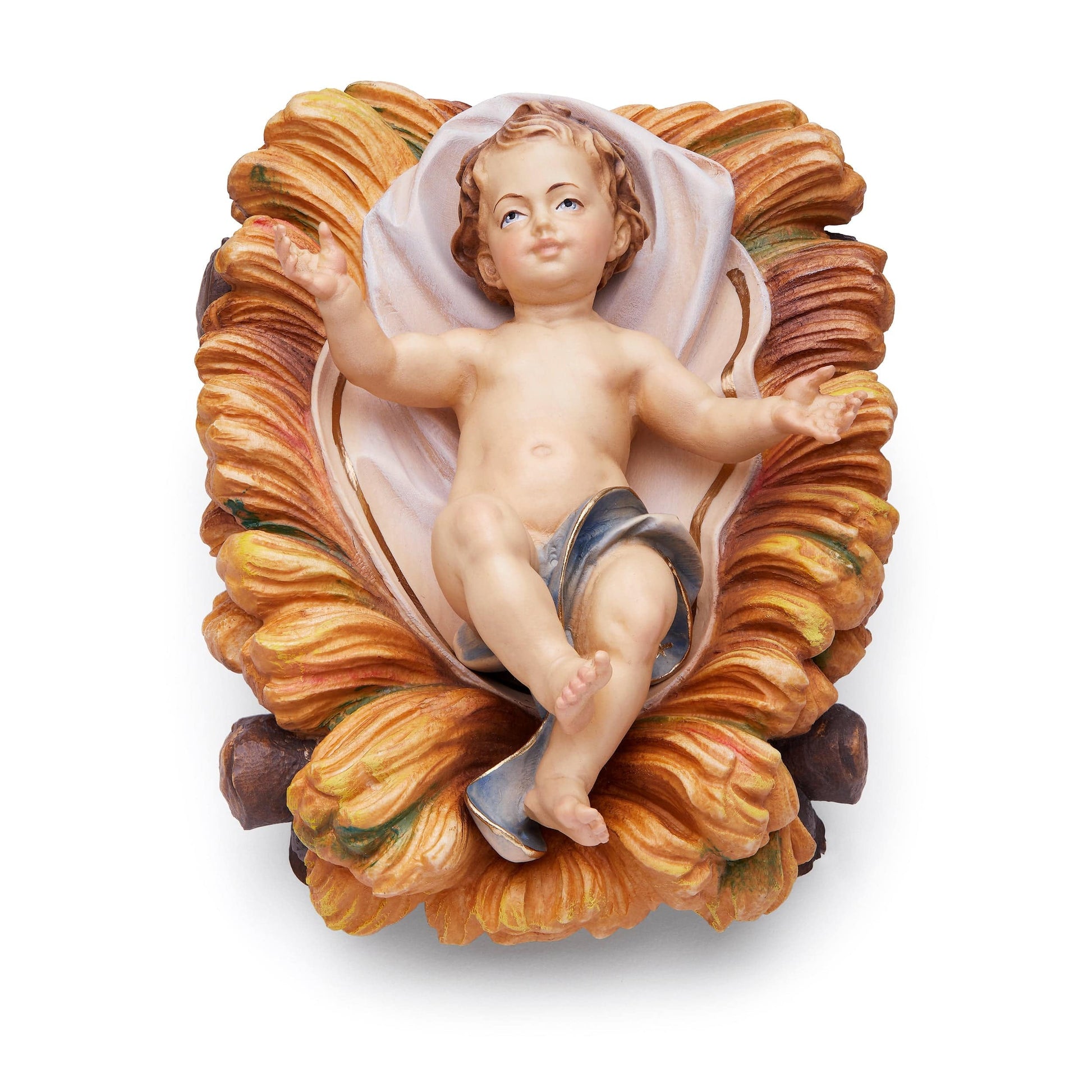 Estatua de madera del Niño Jesús en la cuna. Las dos piezas están pintadas y talladas a mano por escultores del norte de Italia. El niño mide 18 centímetros.