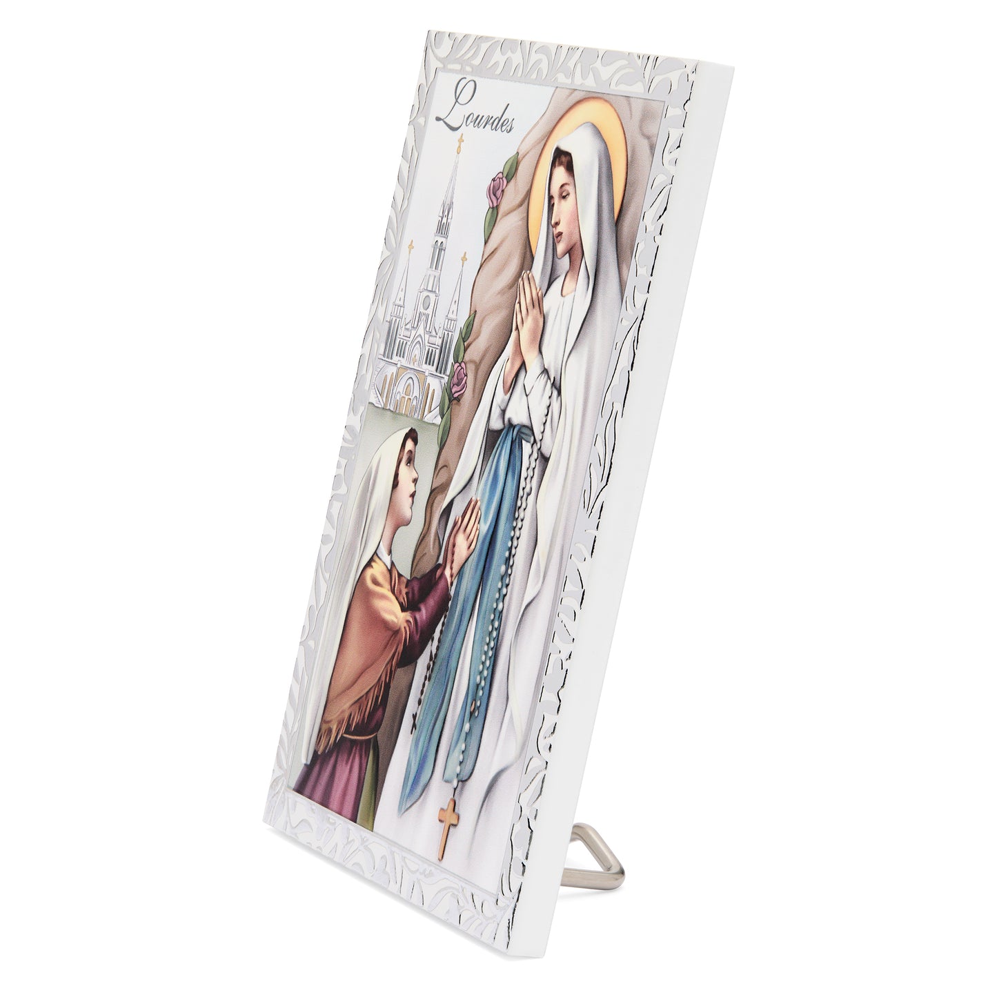 Panel De madera Con Detalles De Plata De Nuestra Señora de Lourdes