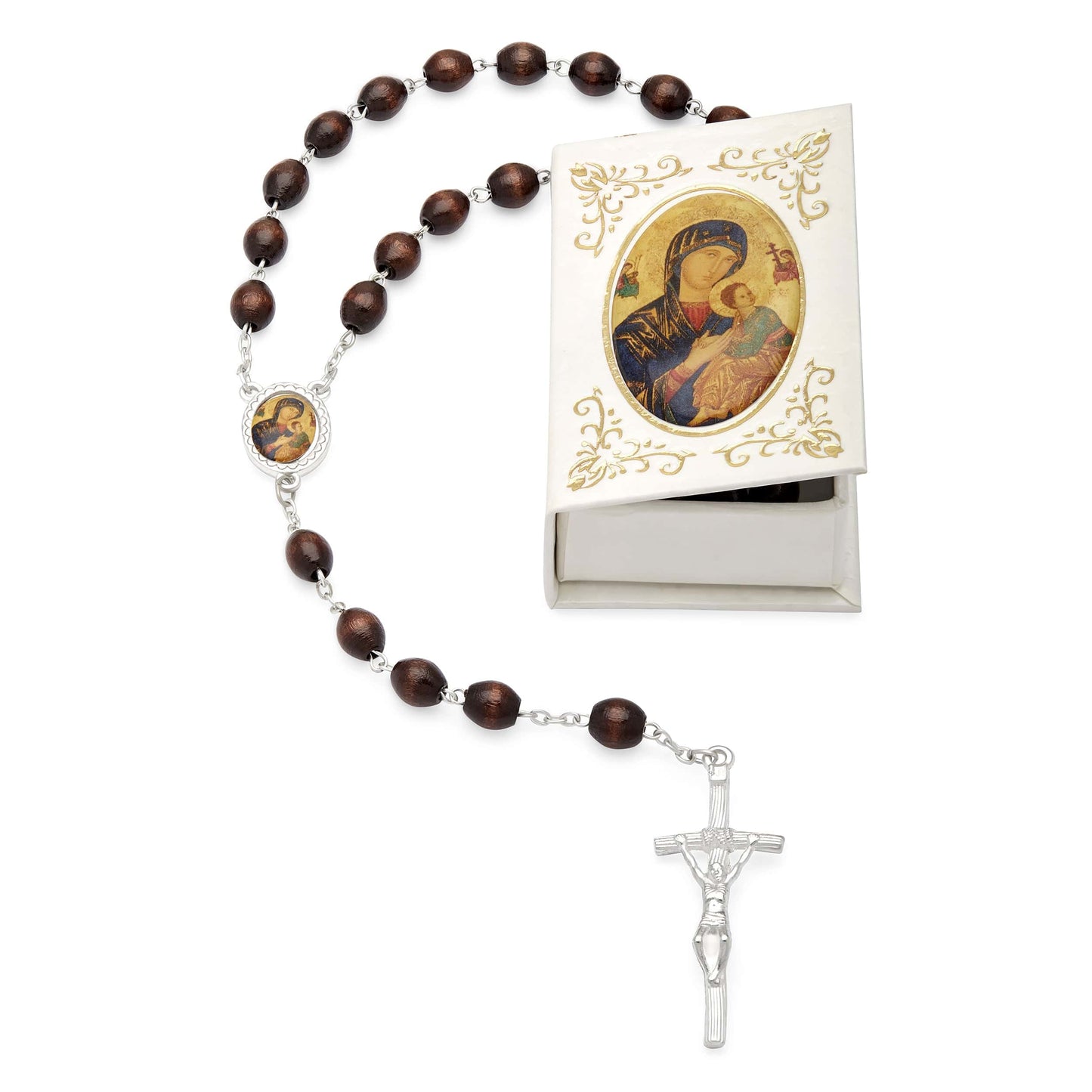 Portarosario Blanco De Nuestra Señora Del Perpetuo Socorro Con Rosario De Madera