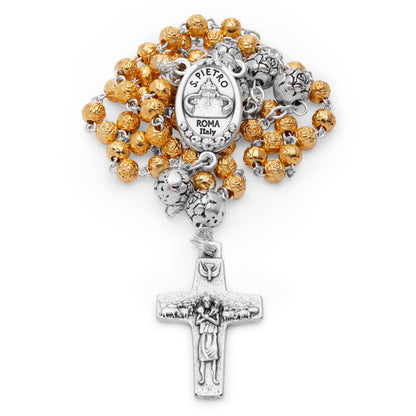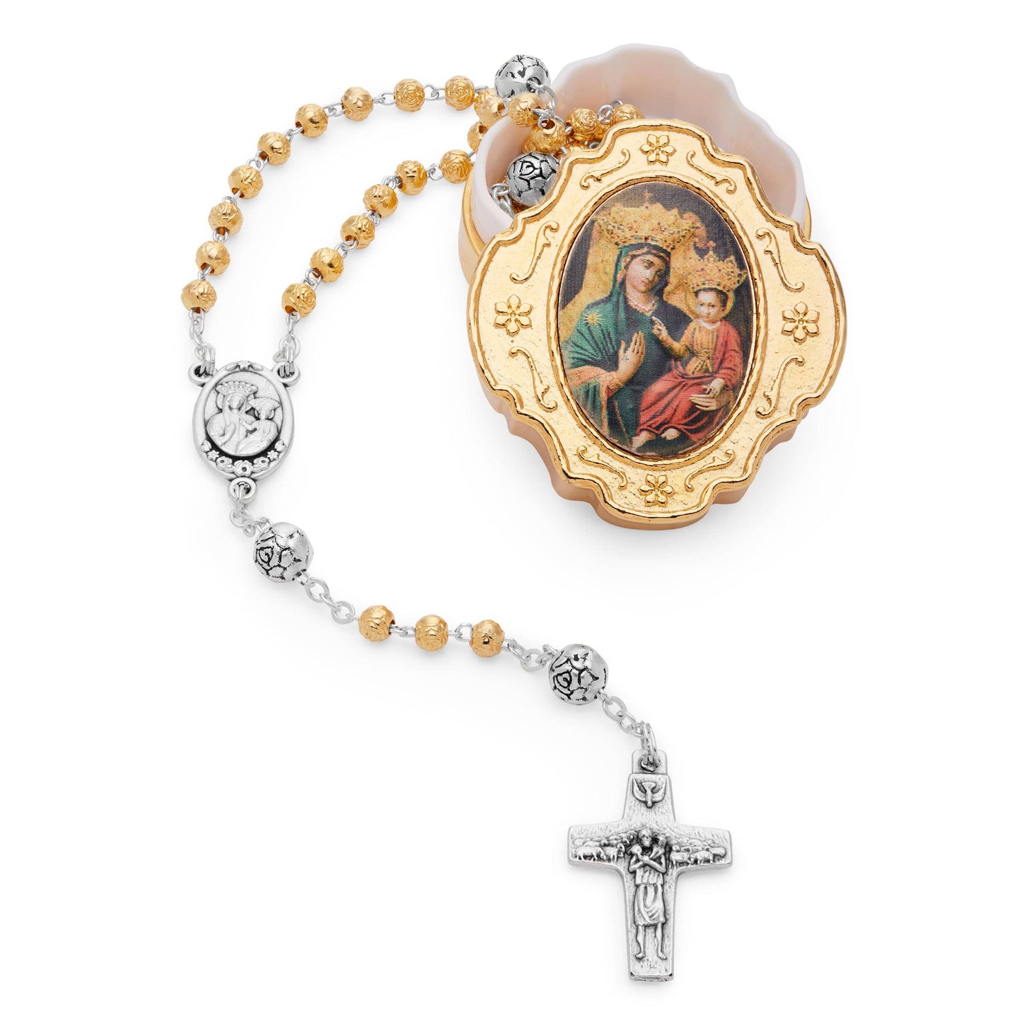 Portarosario Dorado Con Nuestra Señora de la Buena Salud Y Rosario Con Cuentas en Forma De Rosa