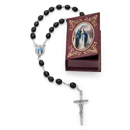 Cajita en forma de libro con l'image de la Virgen Milagrosa, rosario en madera en cuentas ovales, color negro, medalla central de la Virgen, cruz Pastorale.