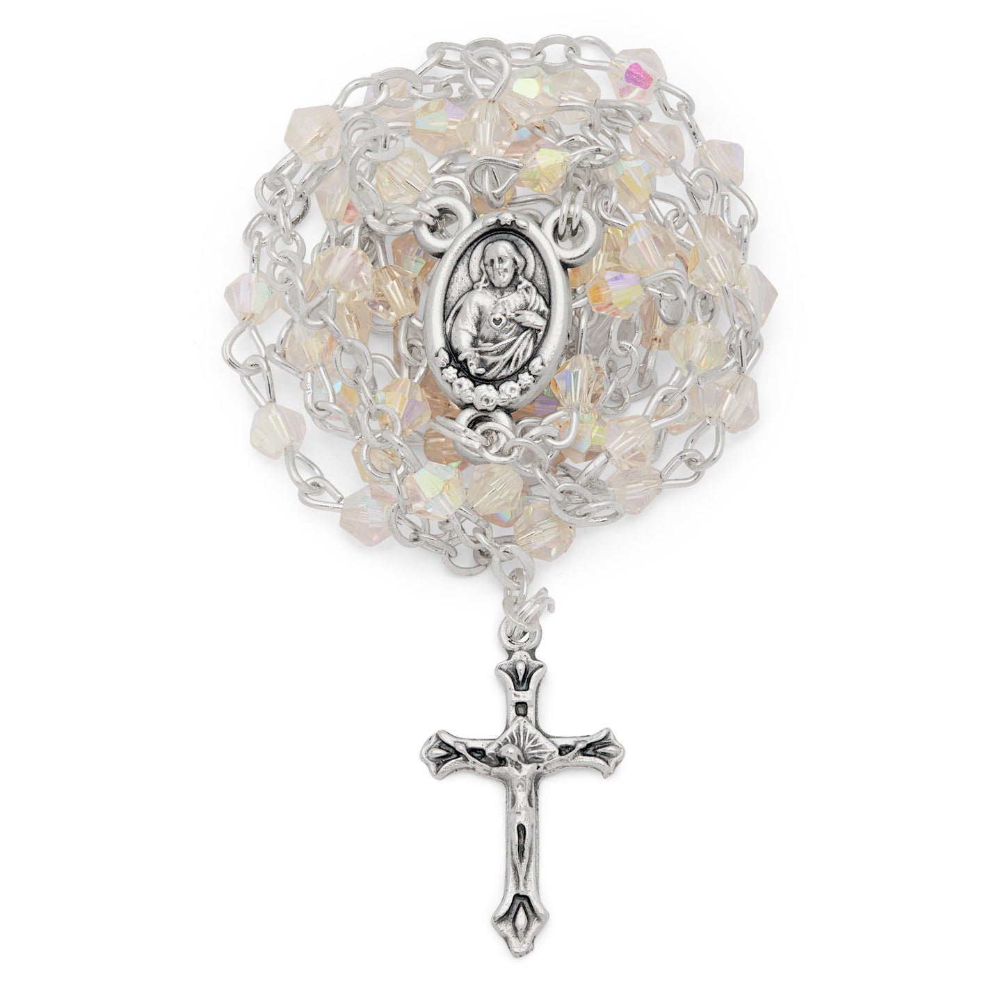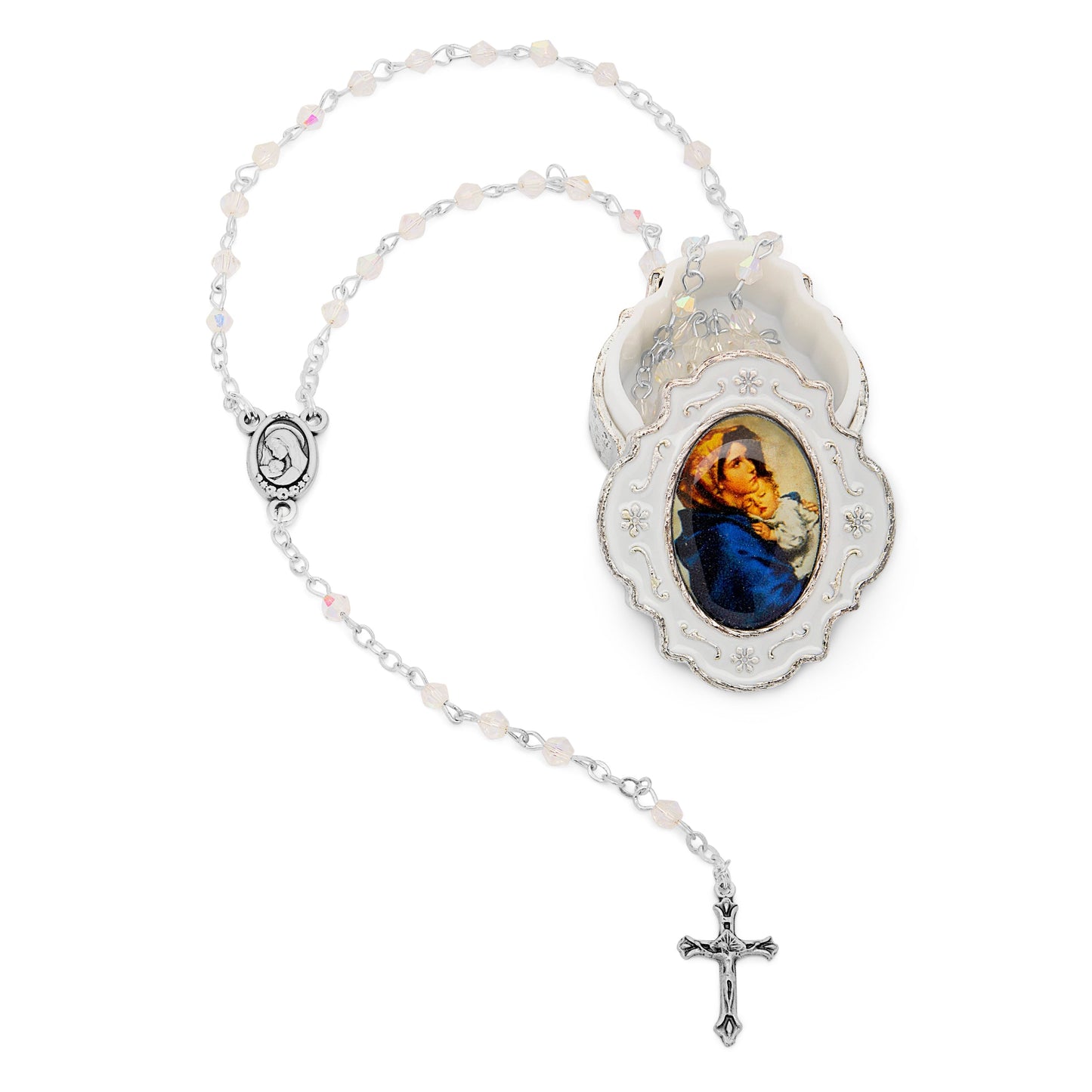 Portarosario Pequeño Esmaltado Blanco De La Madonnina de Ferruzzi Con Rosario De Cristal Blanco