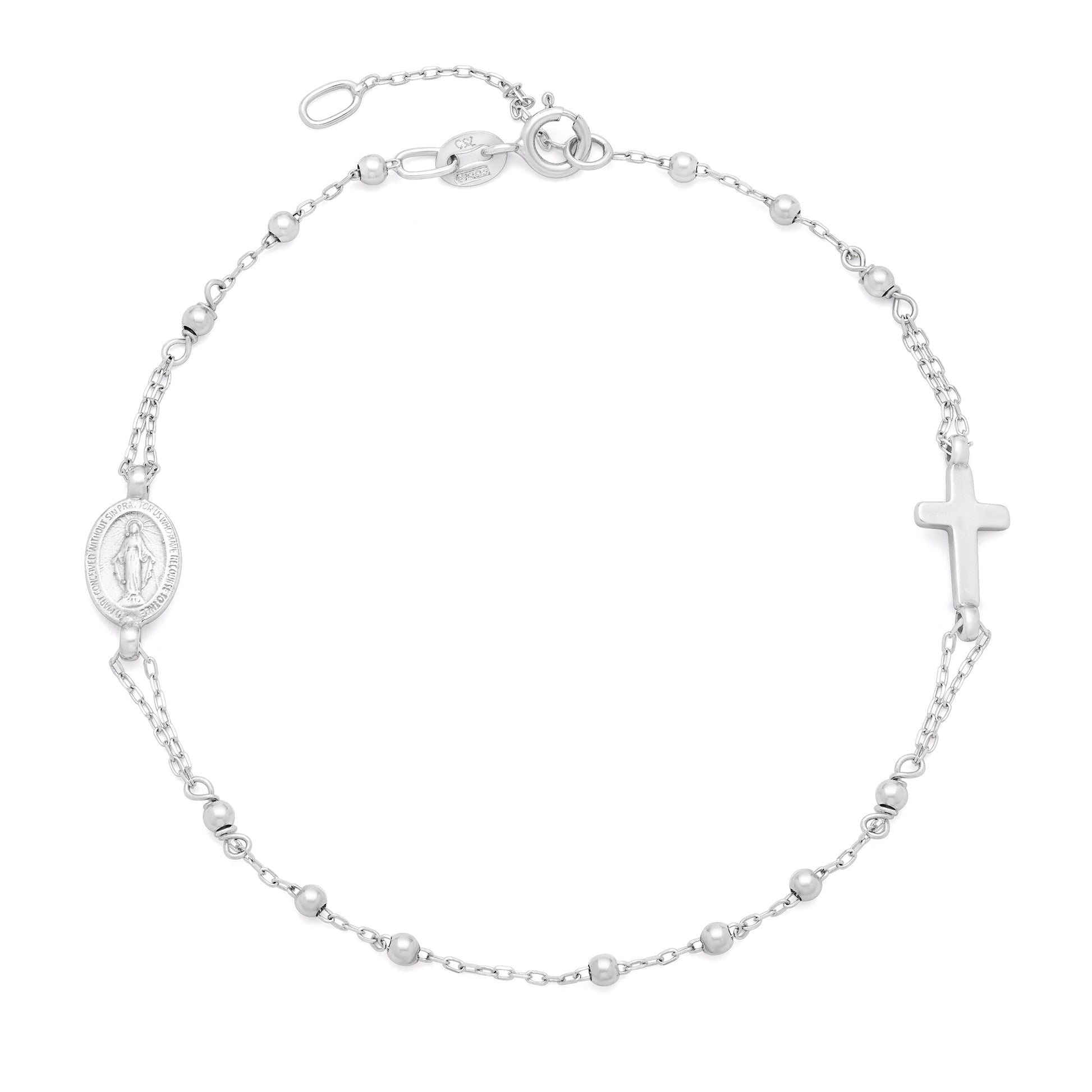 Pulsera Ajustable De Oro Blanco Con Medalla Milagrosa Y Cruz