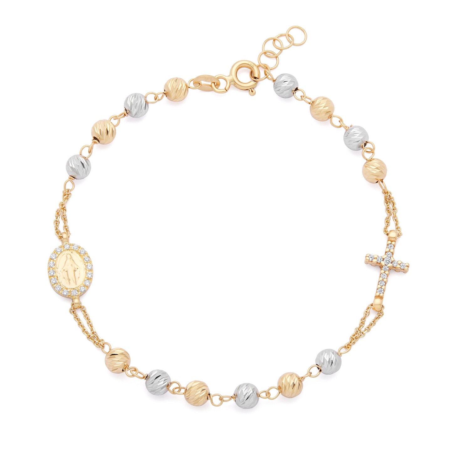 Pulsera Con Cuentas Facetadas De Oro Amarillo Y Oro Blanco Con Medalla Milagrosa Y Cruz Con Circonitas Cúbicas