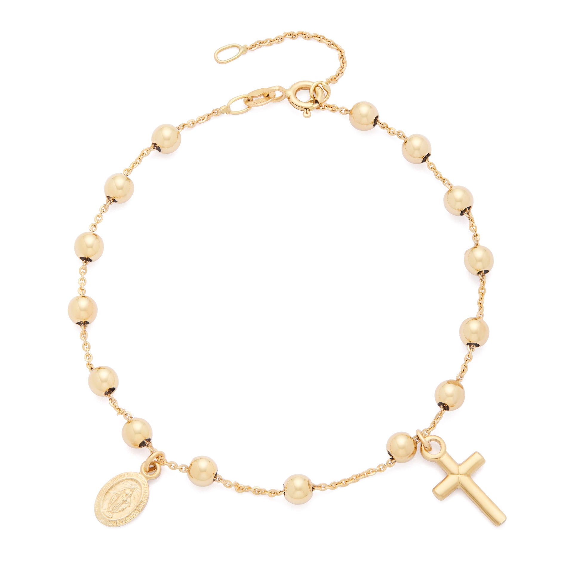 Pulsera de oro amarillo con cuentas lisas y dos colgantes que representan una pequeña cruz y una medalla de María Milagrosa.