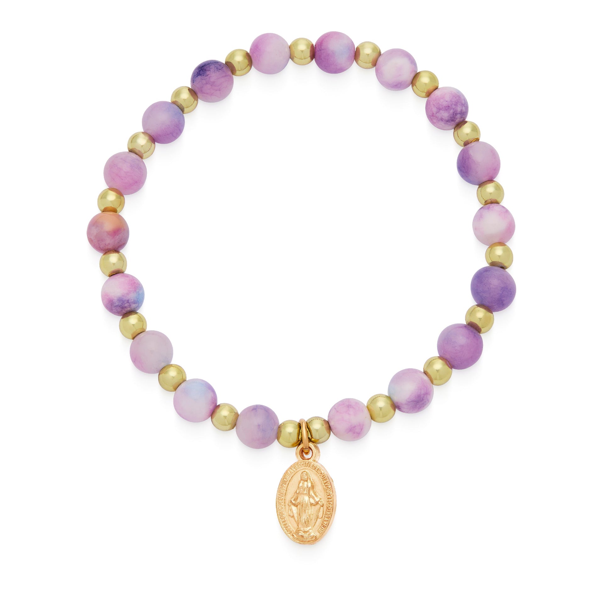 Pulsera Elástica De Calcita Con Tonos Rosa Claro Y Morado Y Medalla Milagrosa