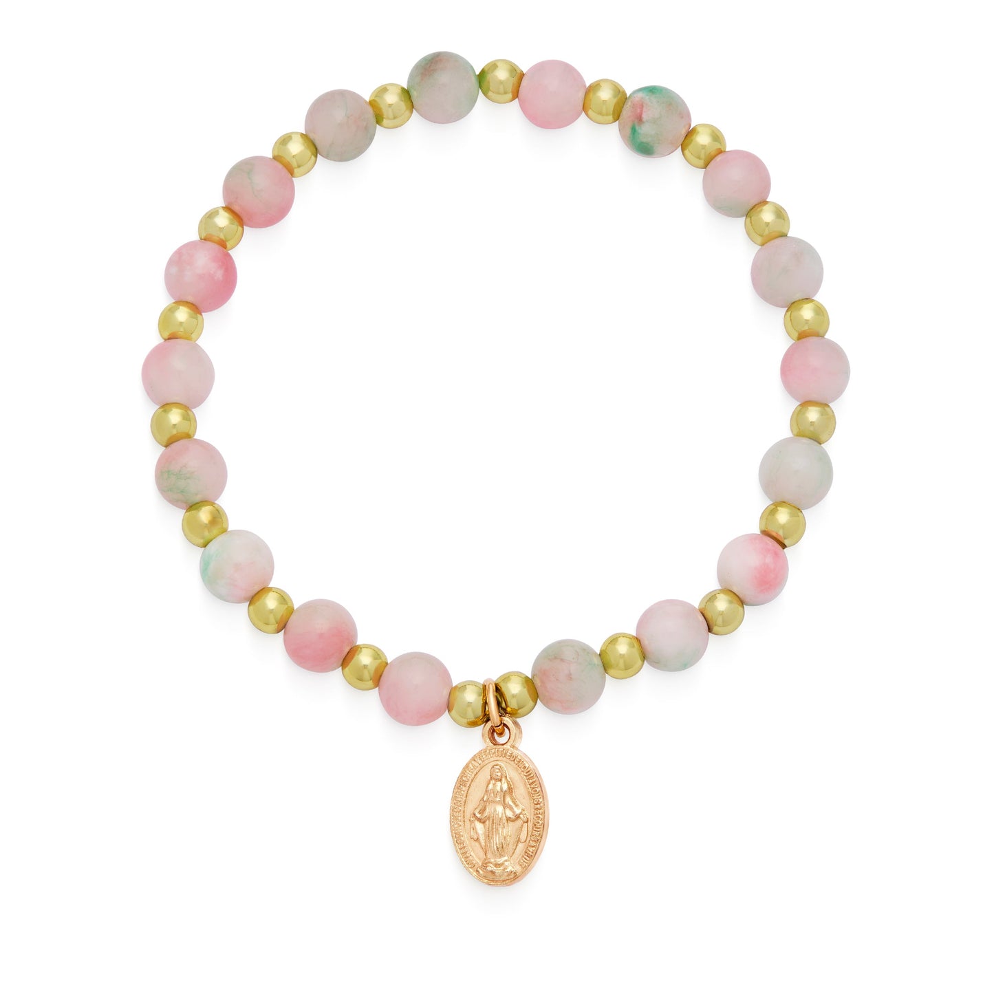 Pulsera Elástica De Calcita Con Tonos Rosa Claro Y Verde Y Medalla Milagrosa