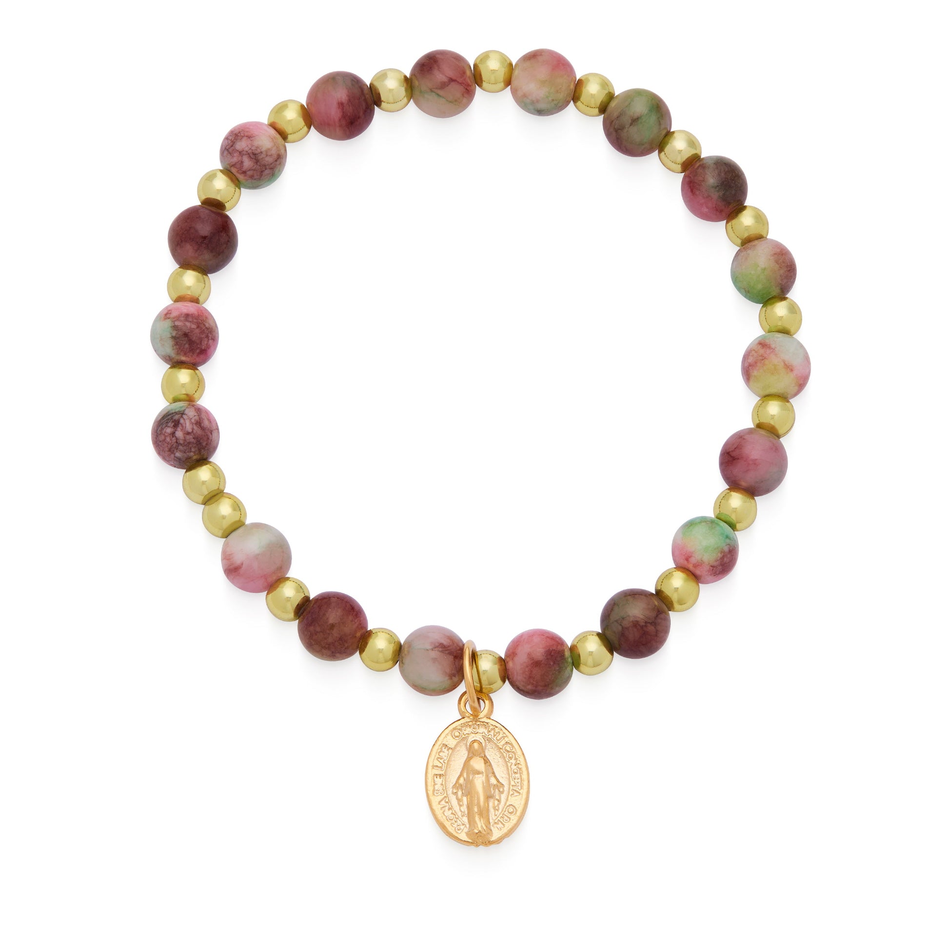 Pulsera Elástica De Calcita Con Tonos Rosa Oscuro Y Verde Y Medalla Milagrosa