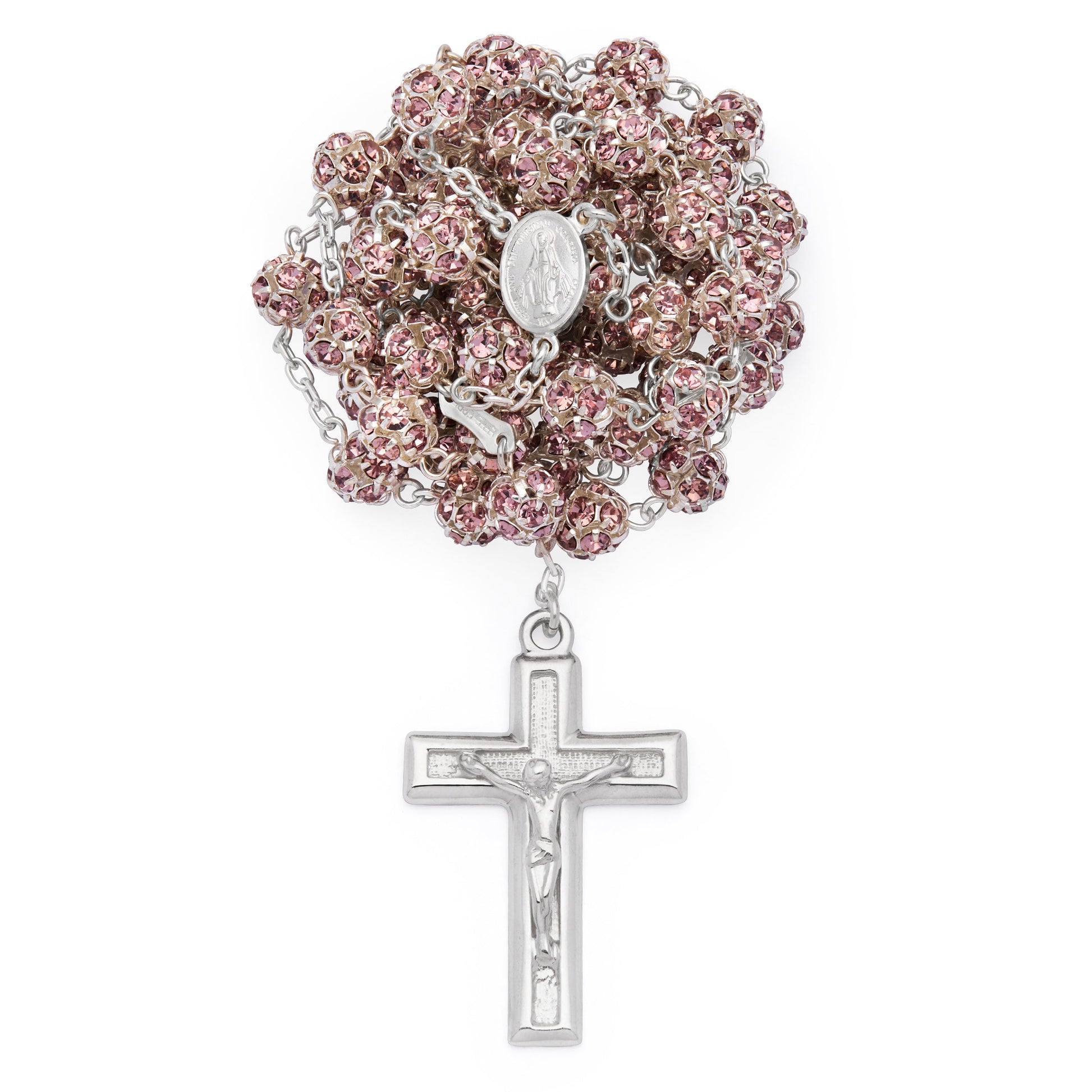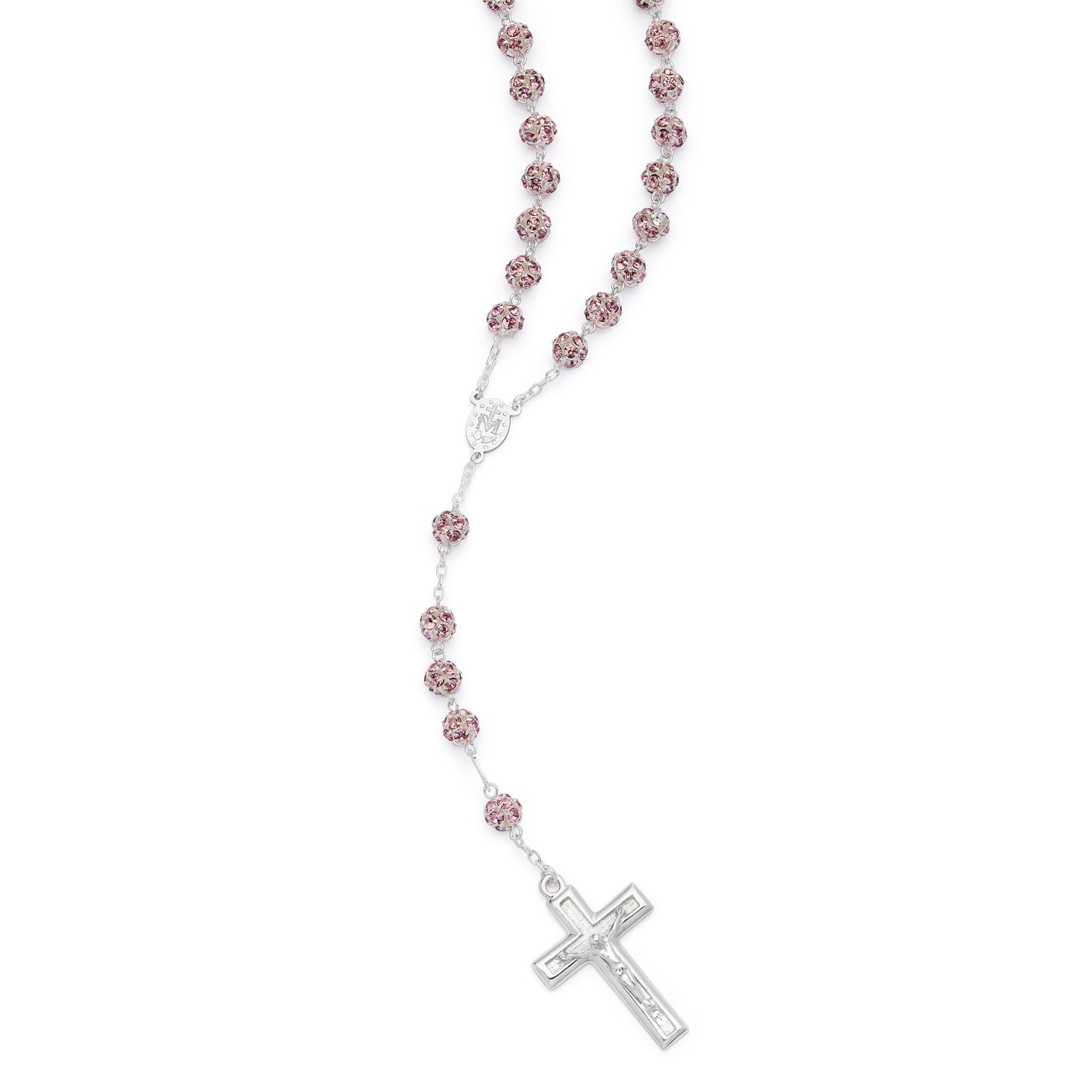 Elegante rosario de plata adornado con brillantes cuentas rosadas de strass que reflejan ternura, amor y serenidad interior. En el centro brilla la Medalla Milagrosa de la Virgen, símbolo de gracia, protección y compasión divina. Un rosario refinado y lleno de significado, ideal como regalo espiritual o como símbolo de una fe delicada para atesorar.