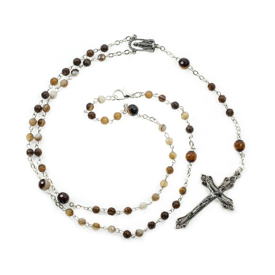 Rosario en piedra en cuentas de 4mm de Agata Marron, Pater Nosters en 6mm, medalla central de la Virgen Milagrosa.
