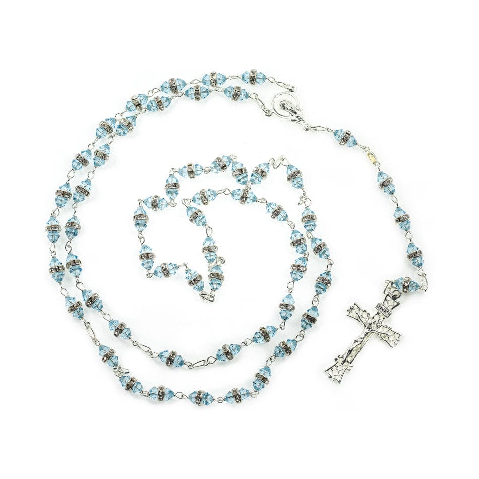 Rosario en cristal facetado, cada bola tiene forma oval separada de un rondel con strass, medalla central de la Virgen Maria, cruz en filigrana de plata.