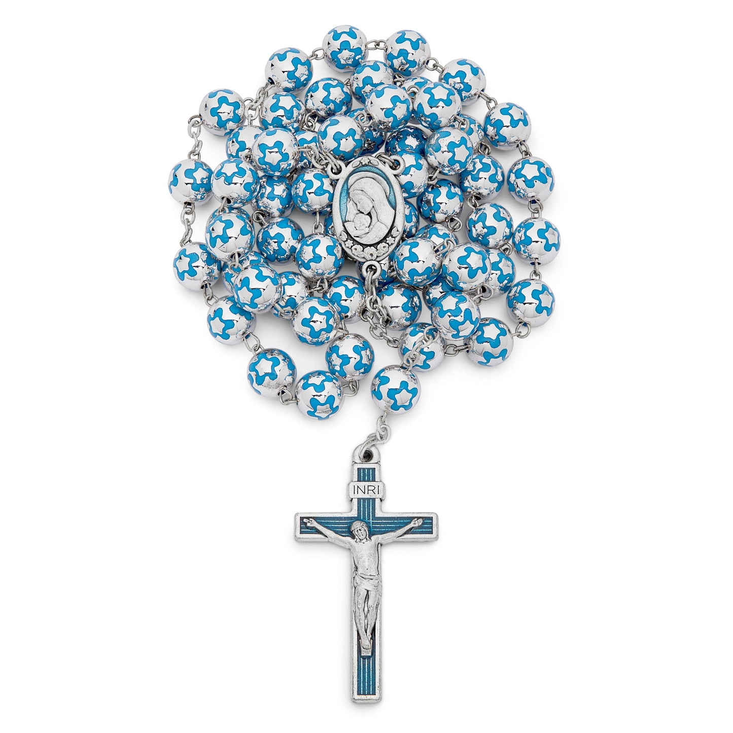 Este elegante rosario en tono plateado presenta cuentas redondas de 10 mm, cada una con una base lisa decorada con delicadas flores azules en el centro. Las cuentas brillan maravillosamente a la luz, combinando el resplandor de la plata con la frescura del azul. La cadena es sólida y resistente, diseñada para soportar el uso diario. En el centro, la medalla esmaltada a doble cara muestra el Sagrado Corazón de Jesús en un lado y a la Virgen María con el Niño Jesús en el otro, ambos acabados con esmalte azul a juego. La gran cruz también está esmaltada en azul, creando un diseño armonioso y refinado.