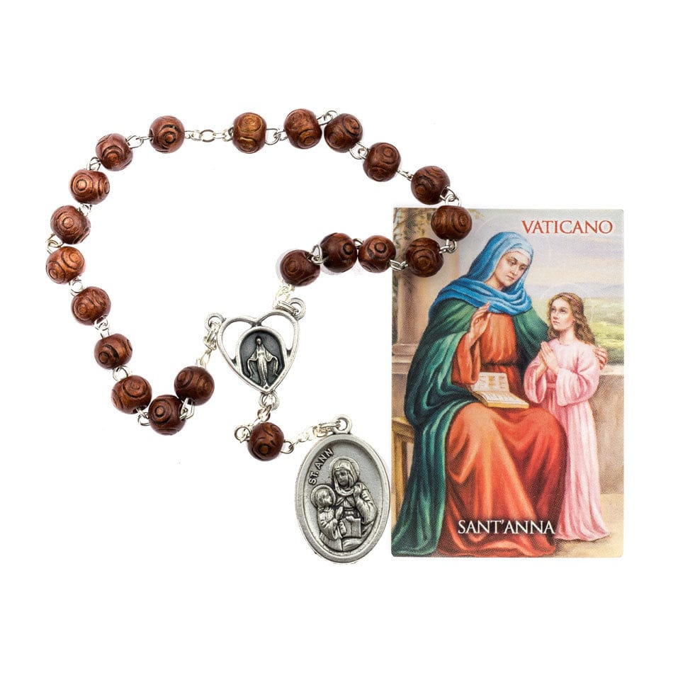 Rosario devocional de Santa Ana, cuentas de madera de 6mm, pieza central con la Virgen Milagrosa, medalla de Santa Ana, estuche de plástico, imagen de papel de Santa Ana y la Virgen María niño.