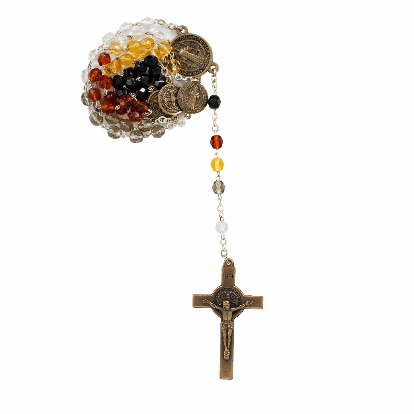 Espléndido Rosario de San Benito caracterizado por Granos de Cristal con tonos marrones, Pater que representa la medalla del Santo y la Cruz de San Benito. La cruz benedictina y la medalla contienen todo el poder protector, símbolo fundamental de protección contra el mal.