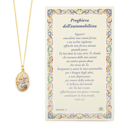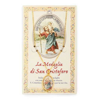 Estampita y medalla con cadena en metal galvanizado de San Cristobal.
