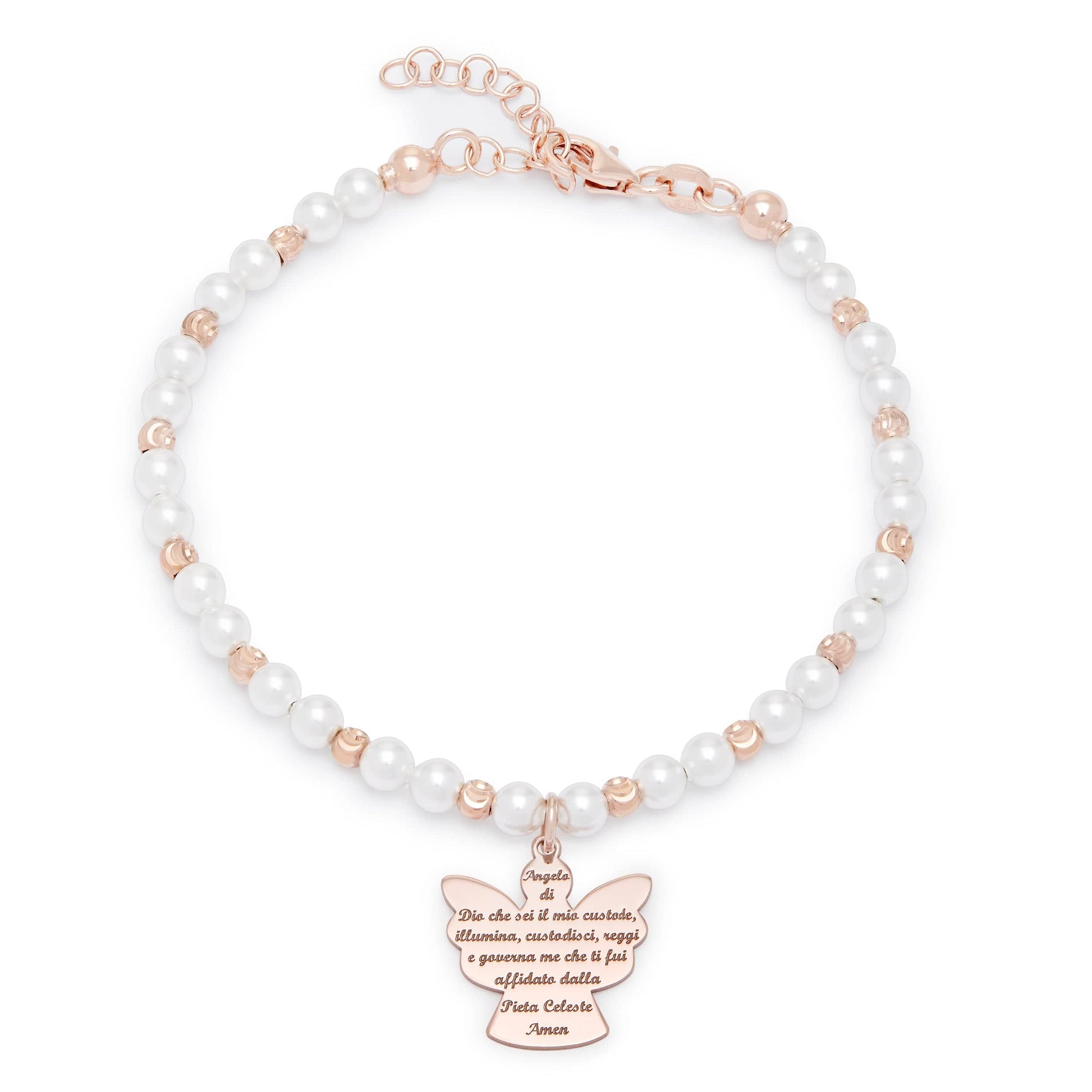 Pulsera bañada en oro con perlas y cuentas de plata. Colgante en forma de ángel con una oración para el ángel de la guarda.