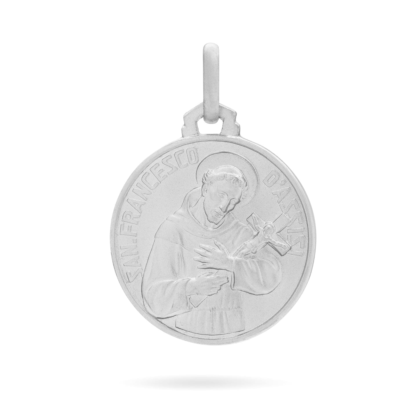 Medalla de plata de ley 925 de San Francisco. Hijo de un comerciante, decidió dedicar su vida al Señor mediante la predicación del Evangelio, la oración y la penitencia. Fue nombrado santo poco después de su muerte, en 1228. Proclamado patrón de Italia en 1939. Protector de los animales y de los comerciantes.