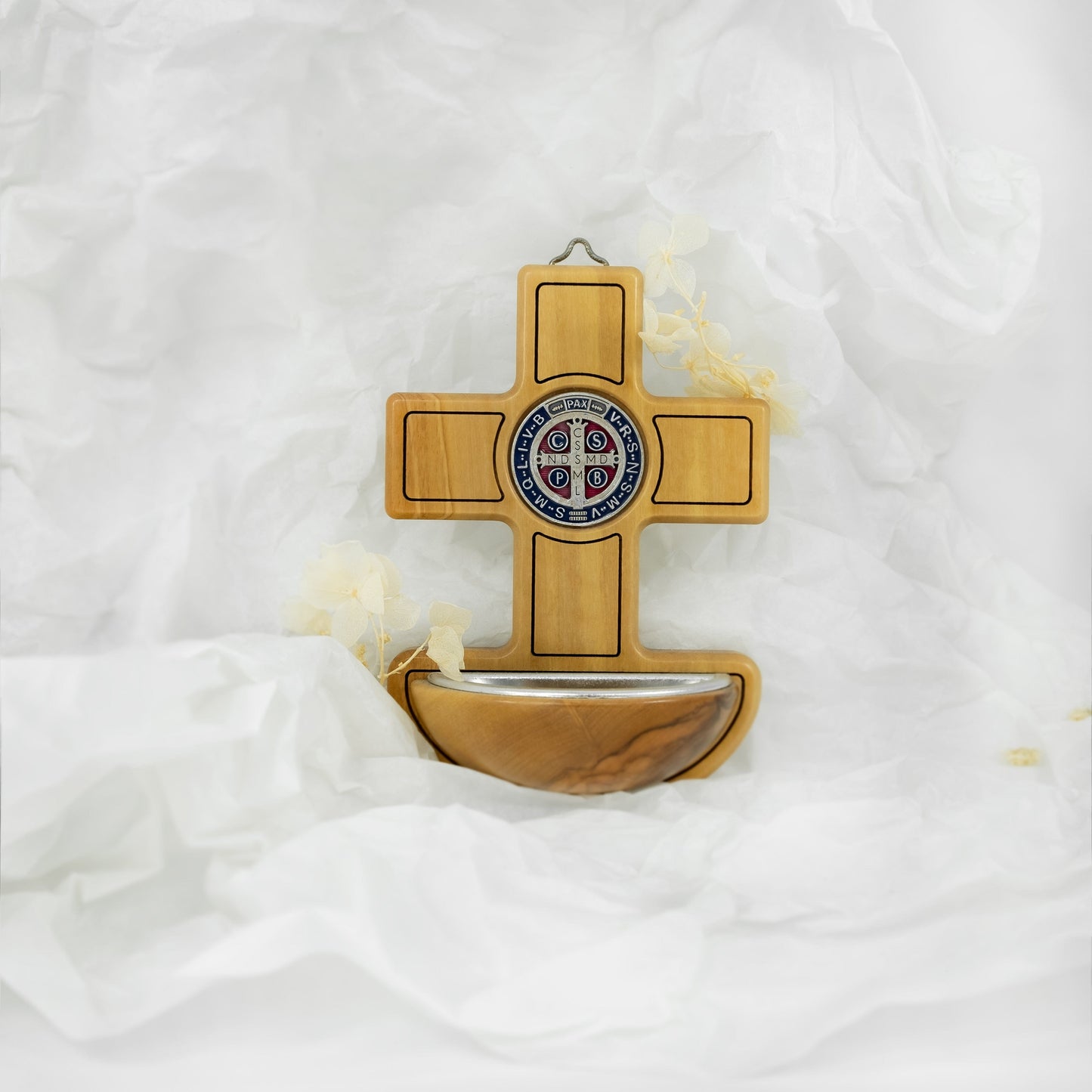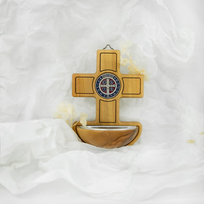 Pila agua bendita de pared de auténtica madera de olivo con medalla de San Benito esmaltada.